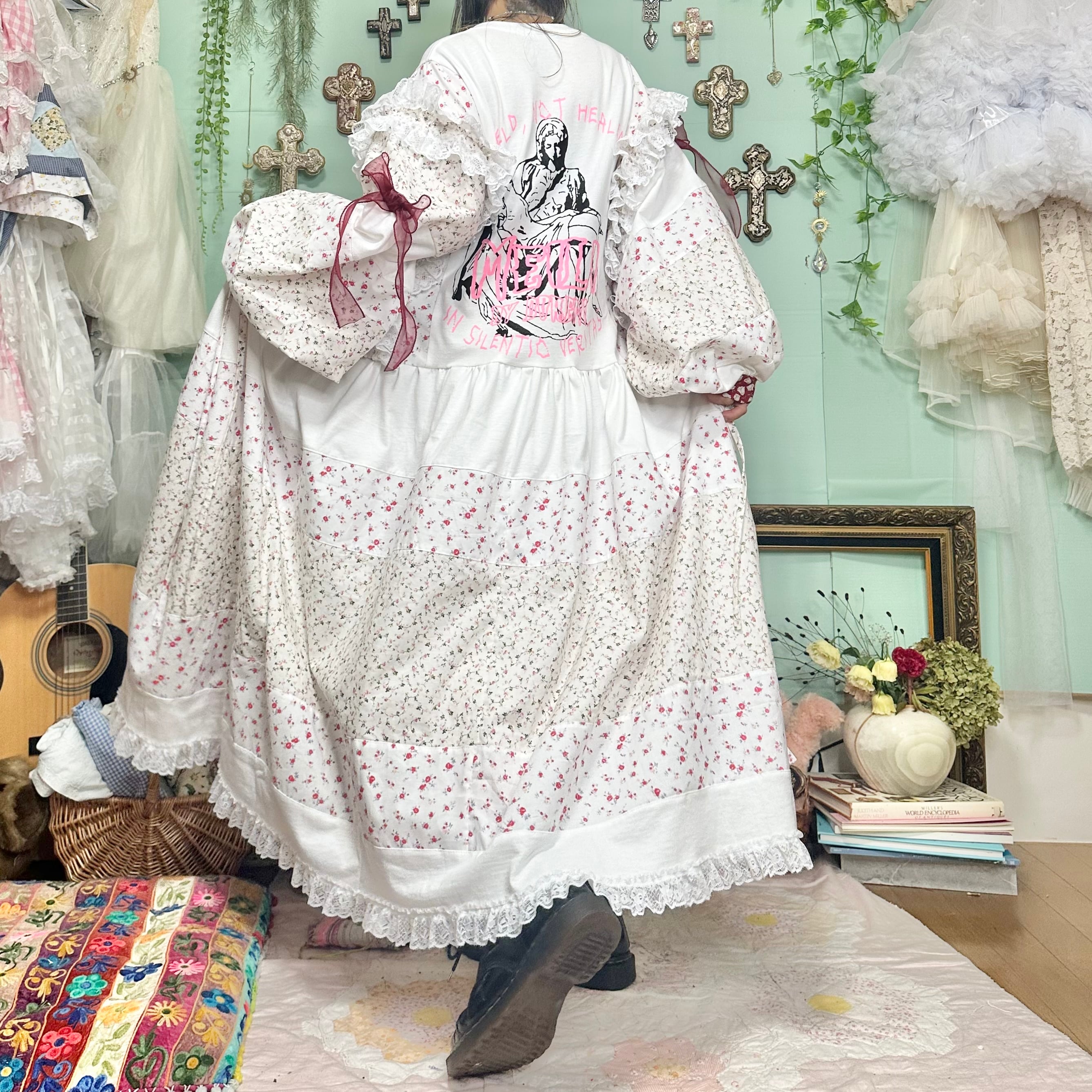 大胆にピエタをシルクスクリーンでバックプリントしたオリジナルTシャツをリメイクしたワンピース。