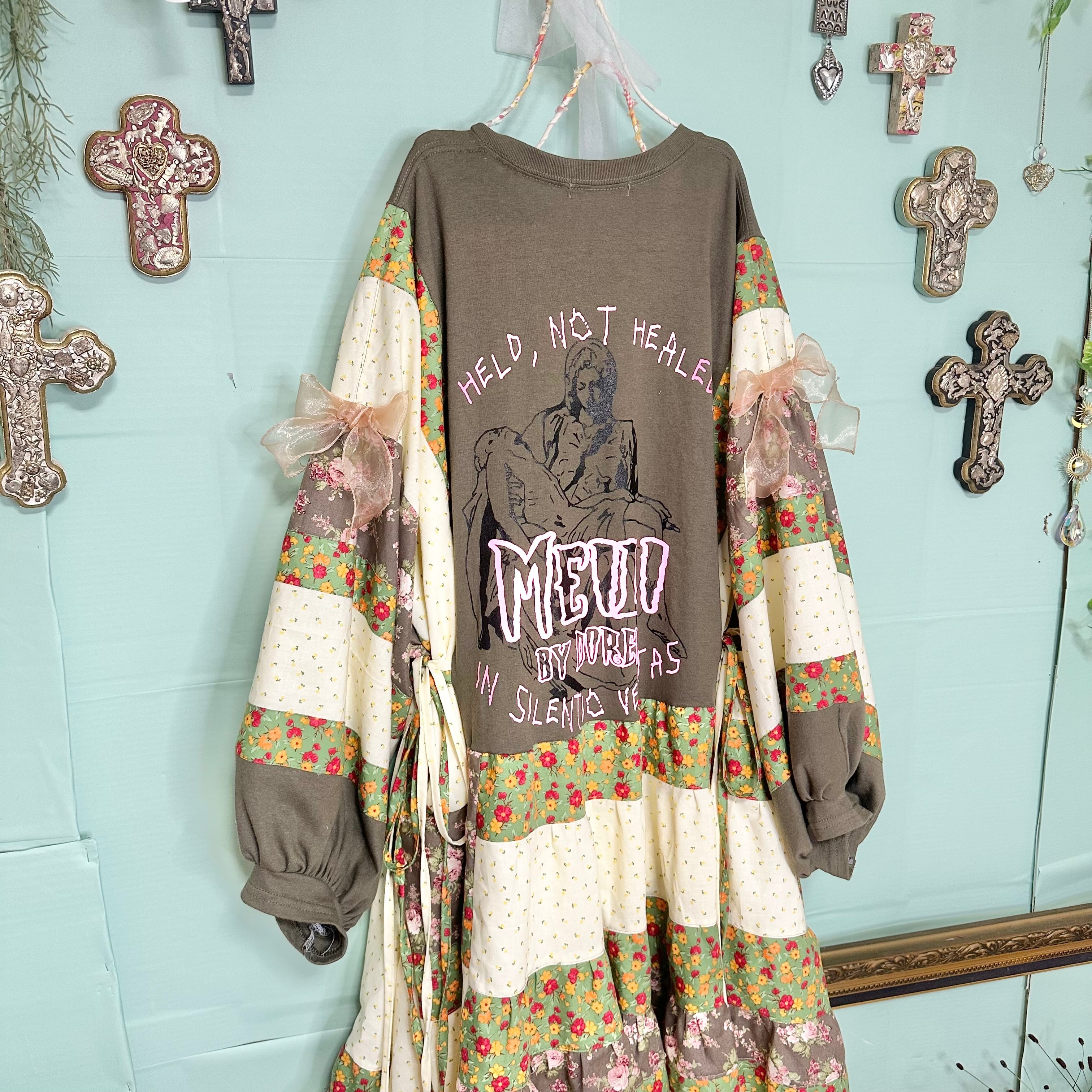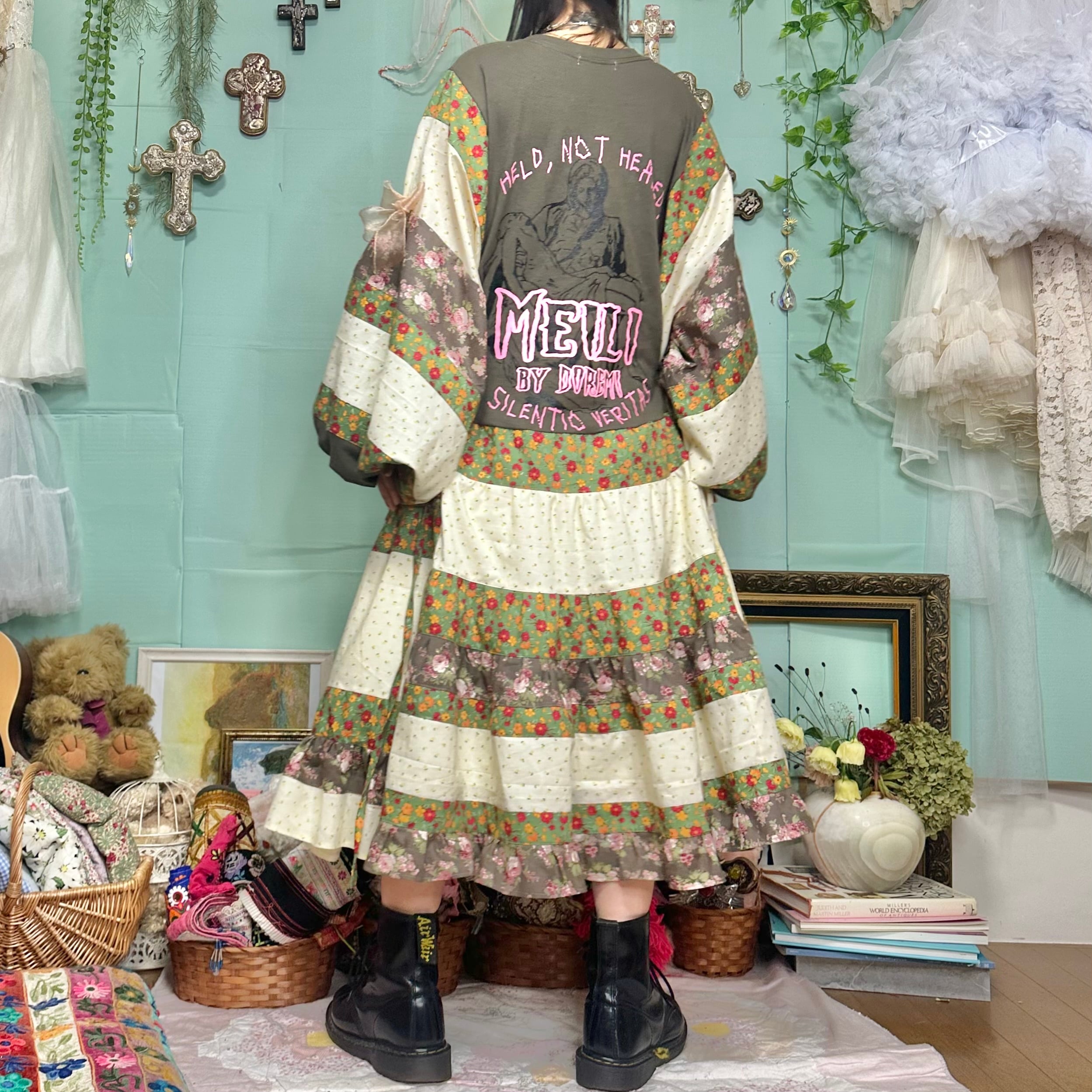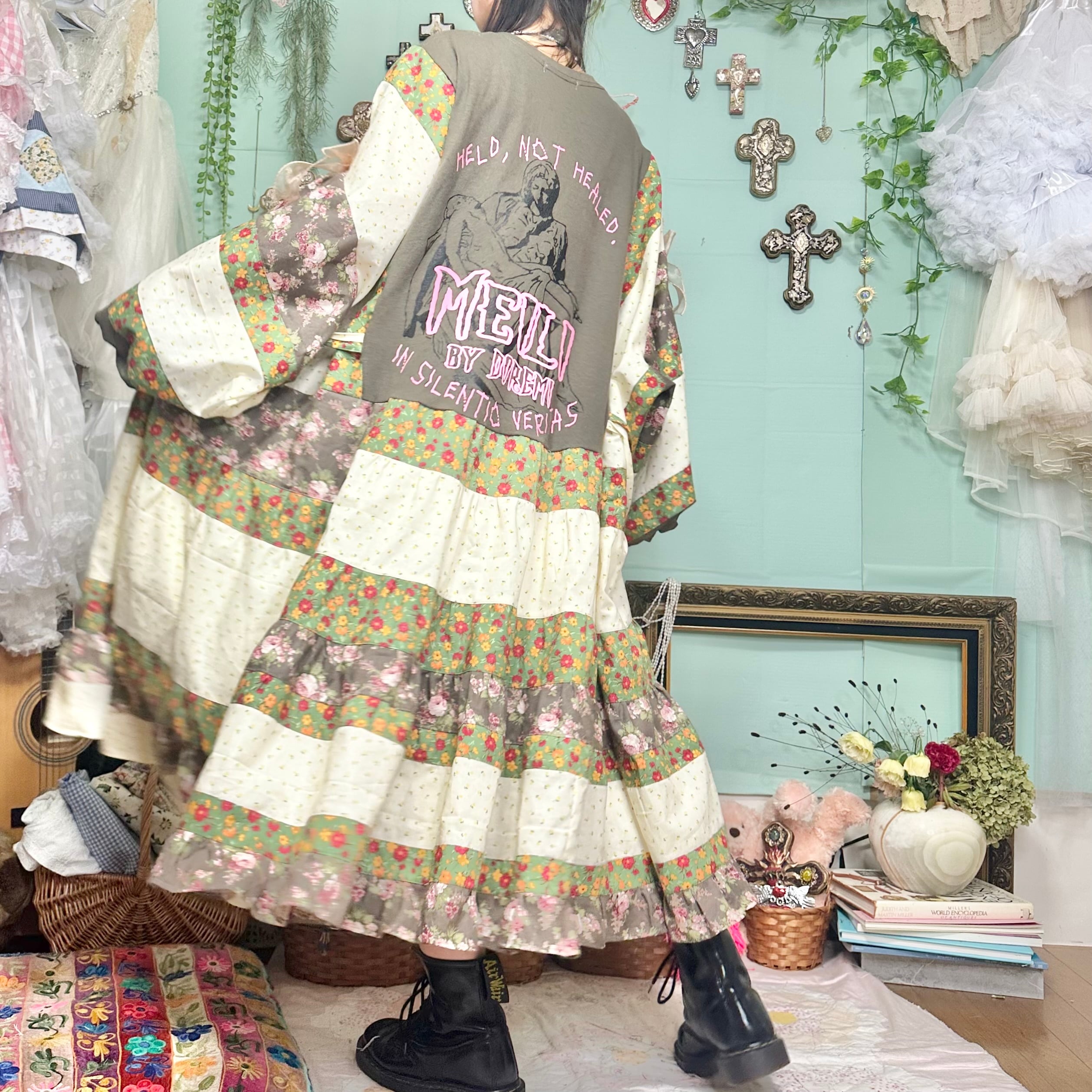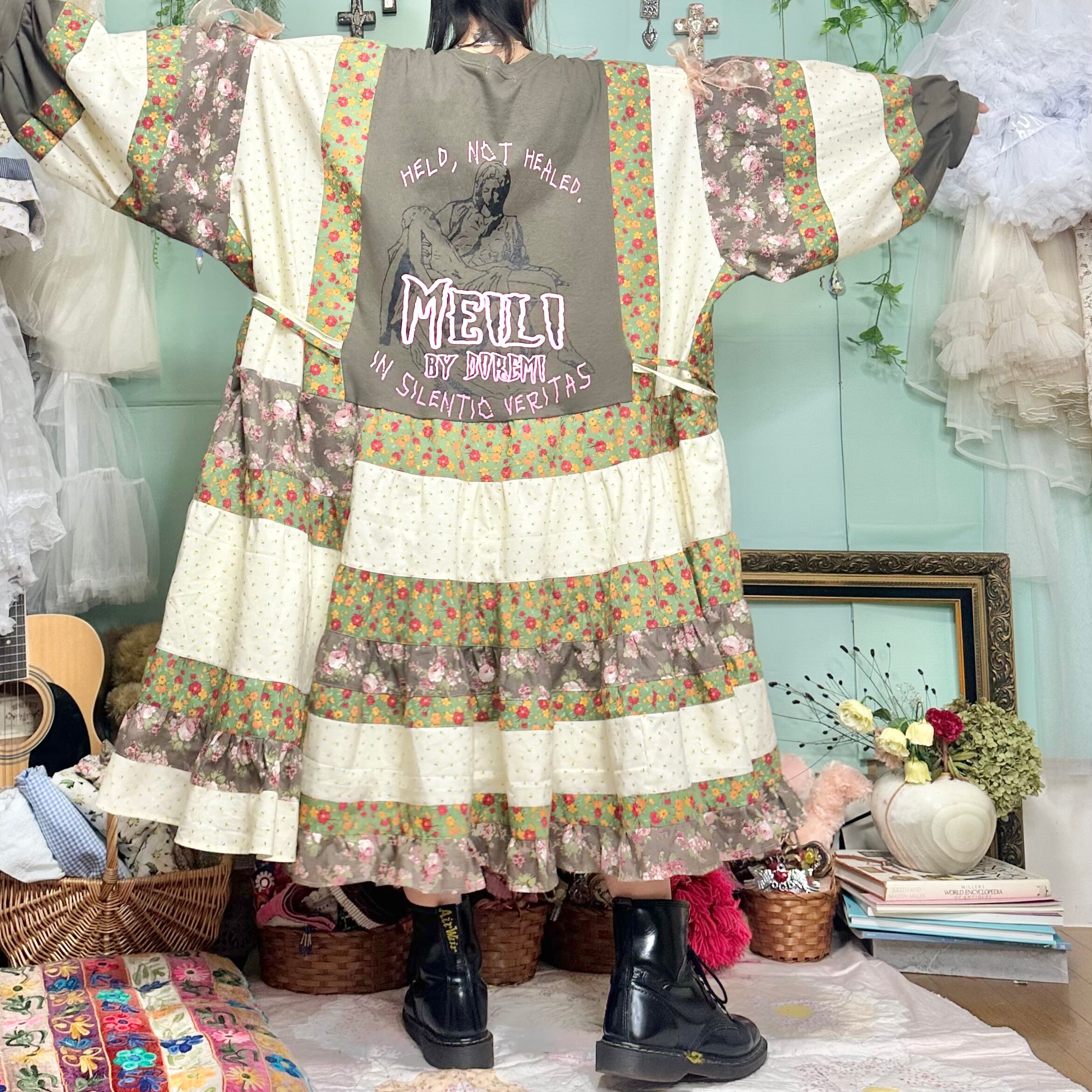 大胆にピエタをシルクスクリーンでバックプリントしたオリジナルTシャツをリメイクしたワンピース。