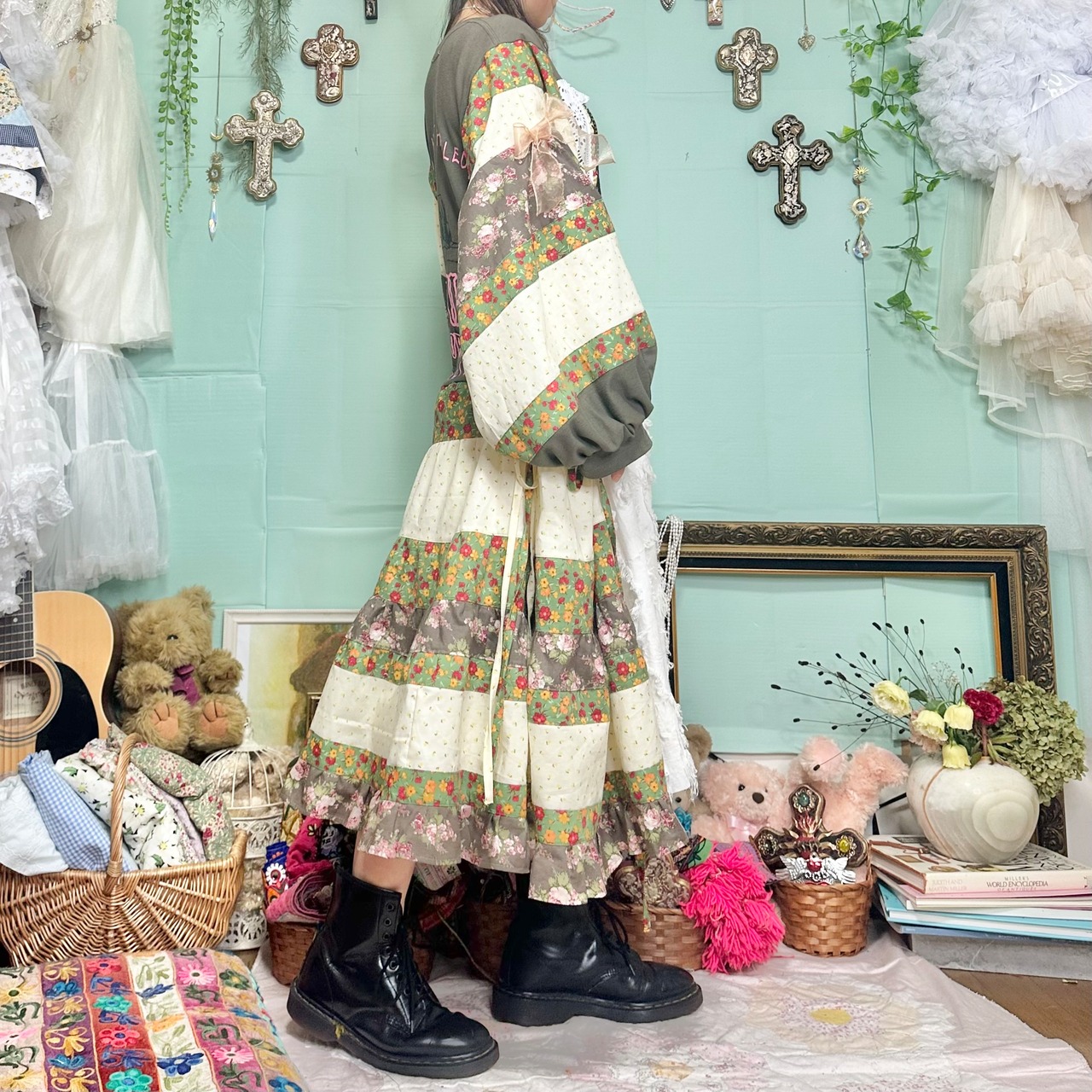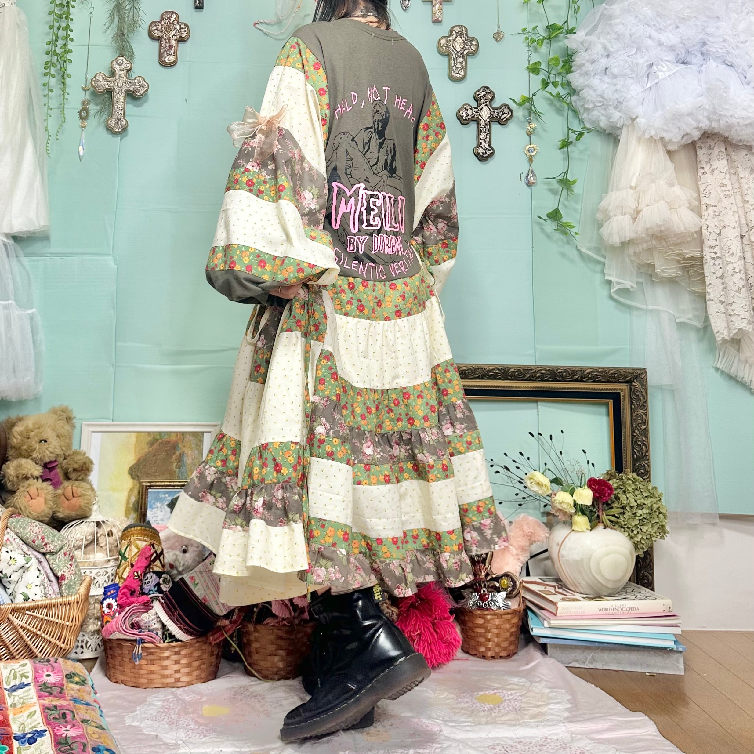 薄黄色の小花柄に燃え踊るようなグリーン生地に黄色と赤色の花柄の組み合わせは古着好きにはたまらないデザイン。