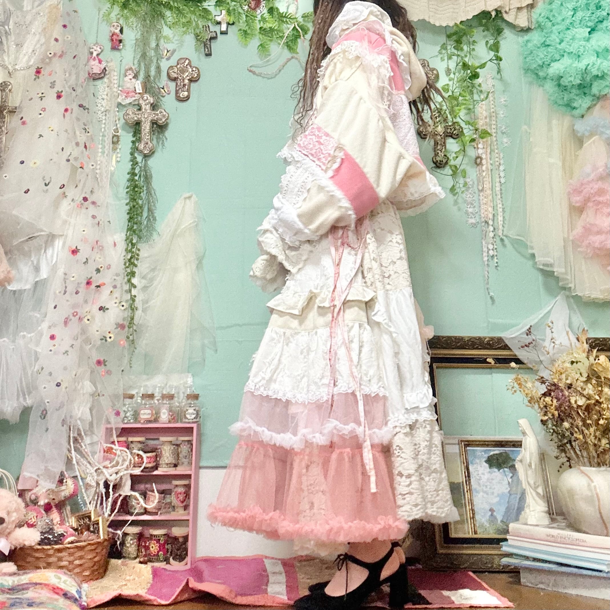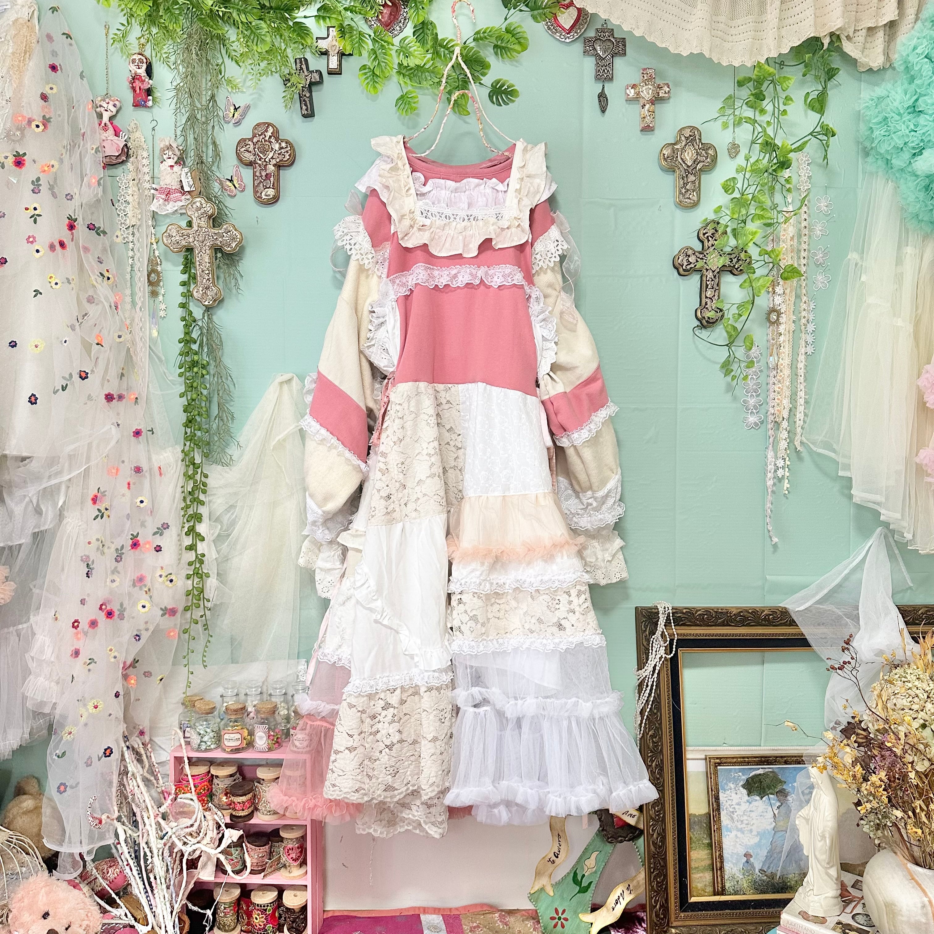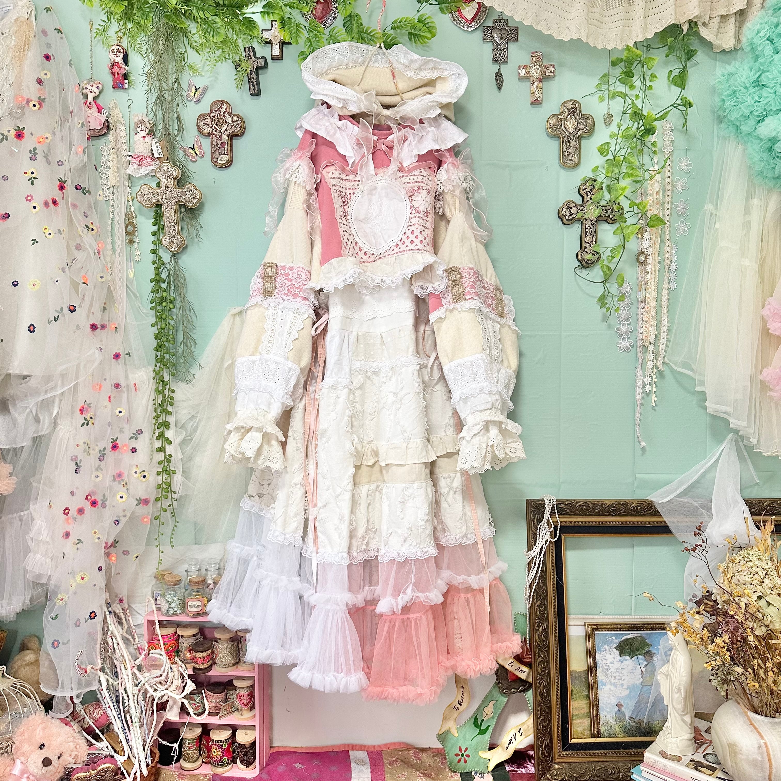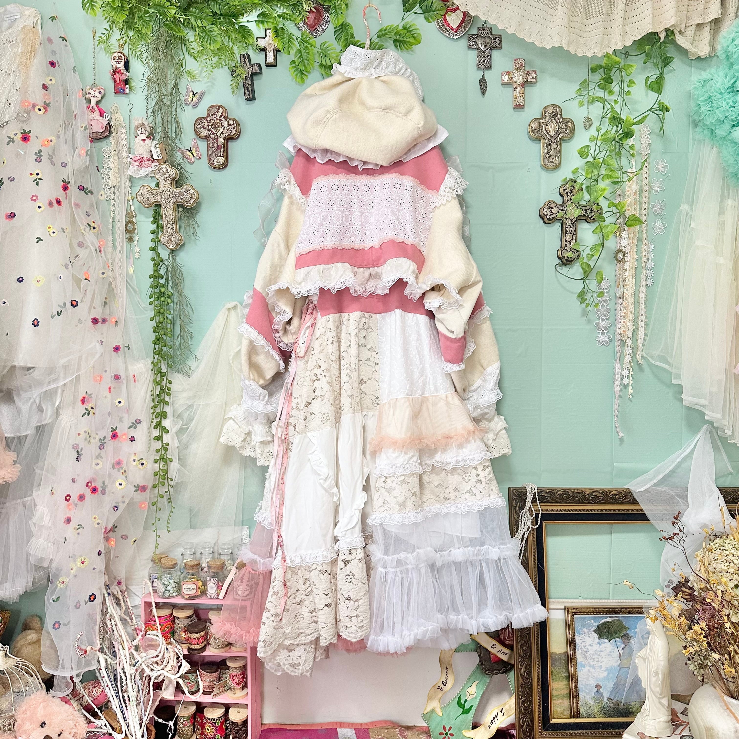 美と長寿を複合するこのピンクが長く美しさを保てるように刺繍入りの生地やクロスをふんだんに使ってワンピースもデザインしました。