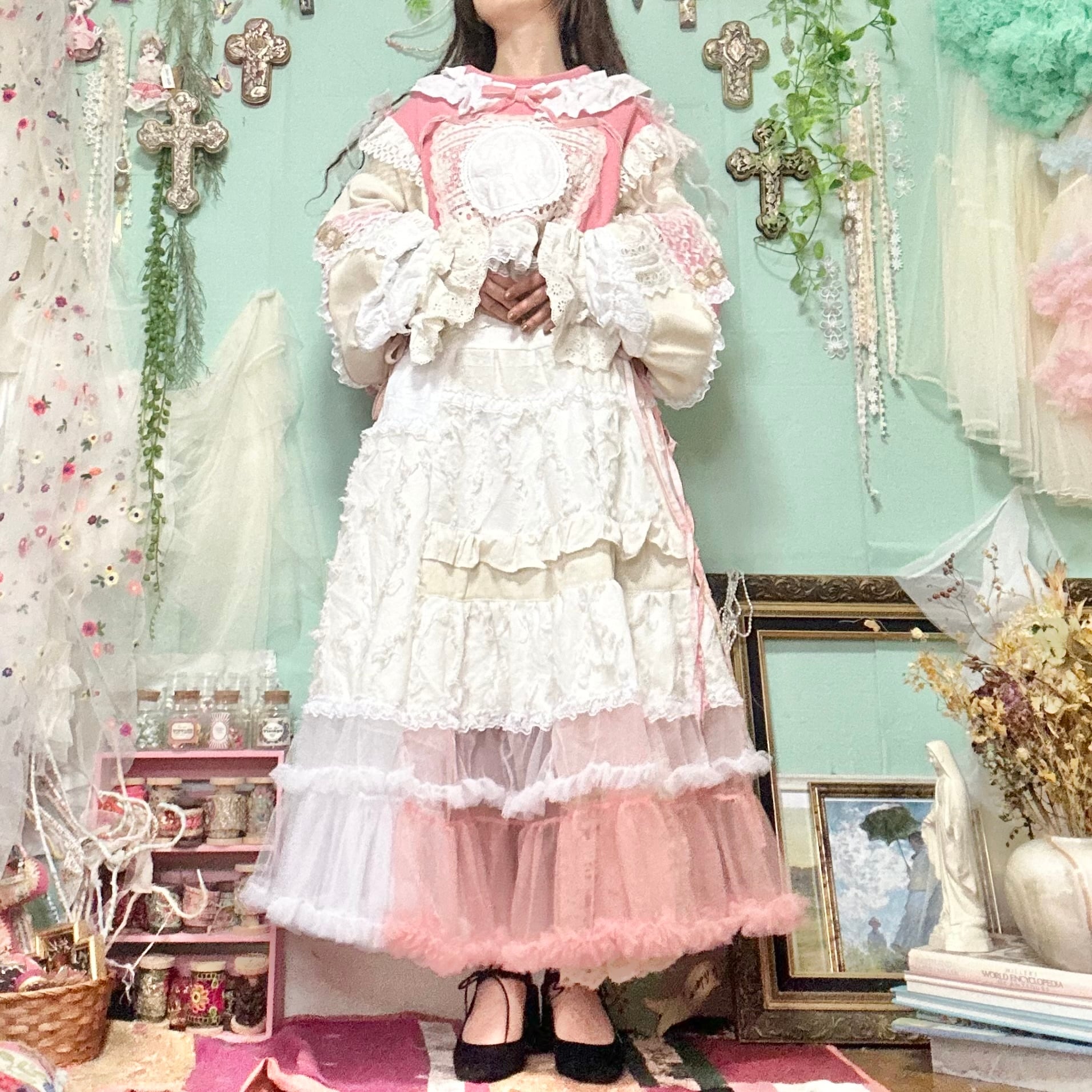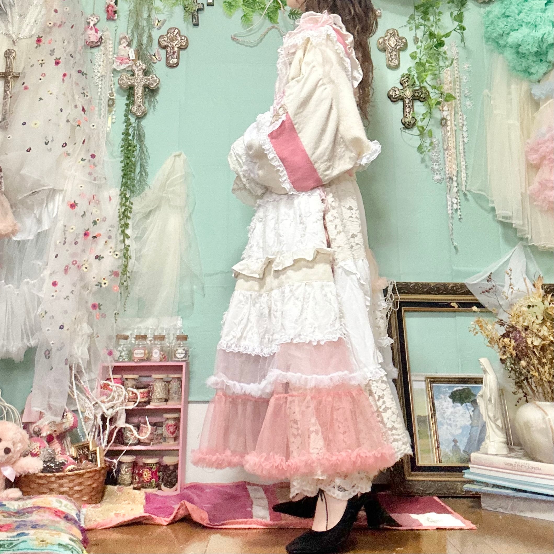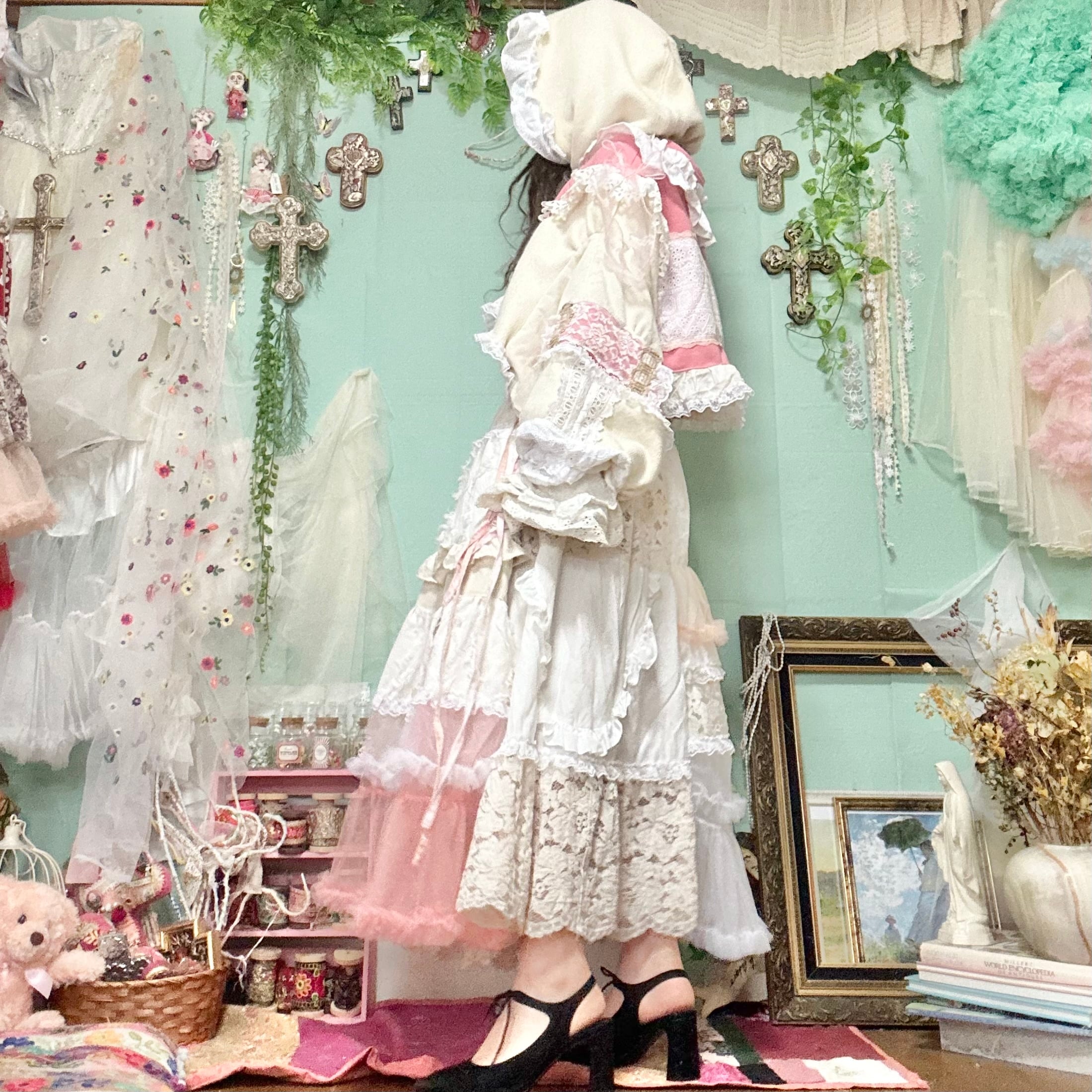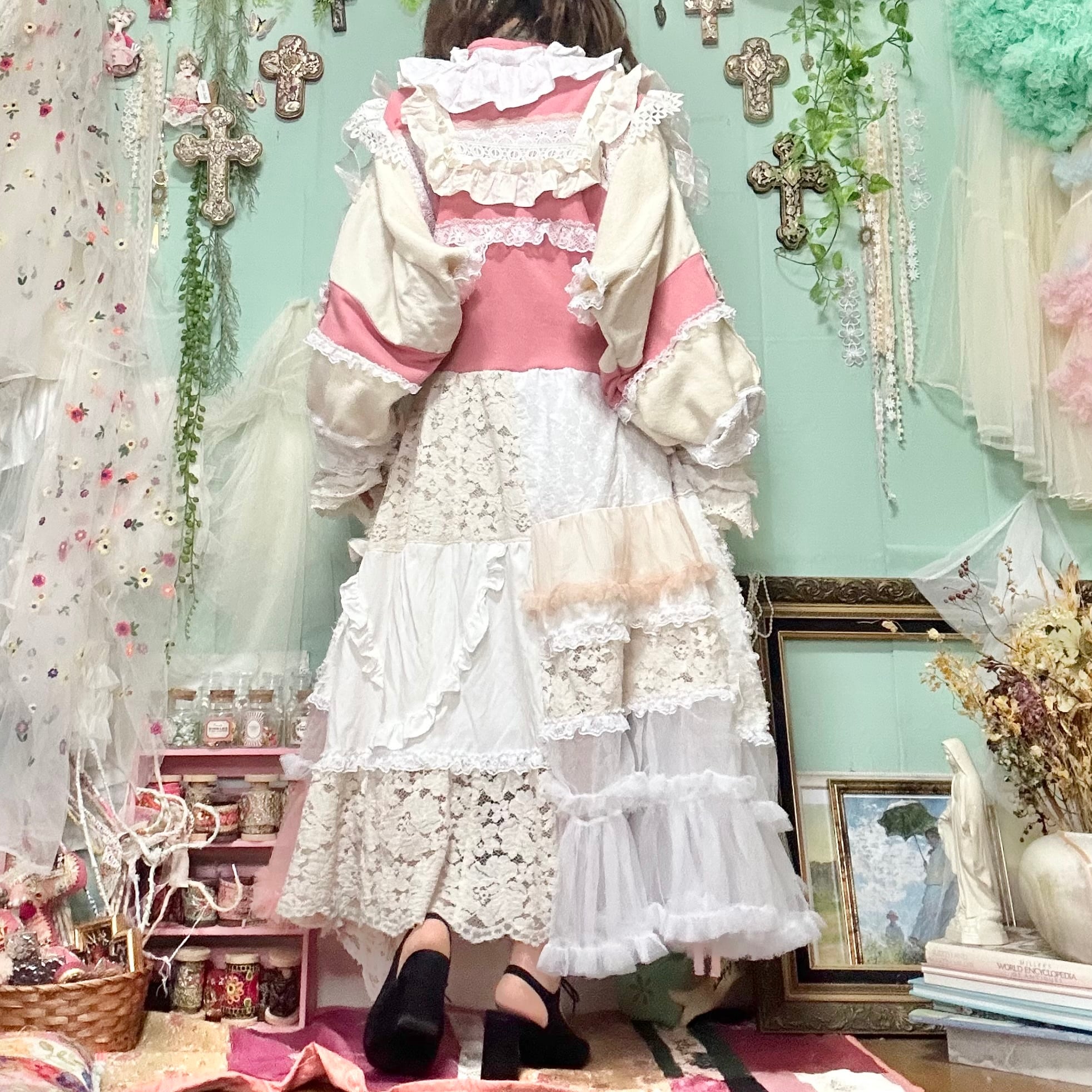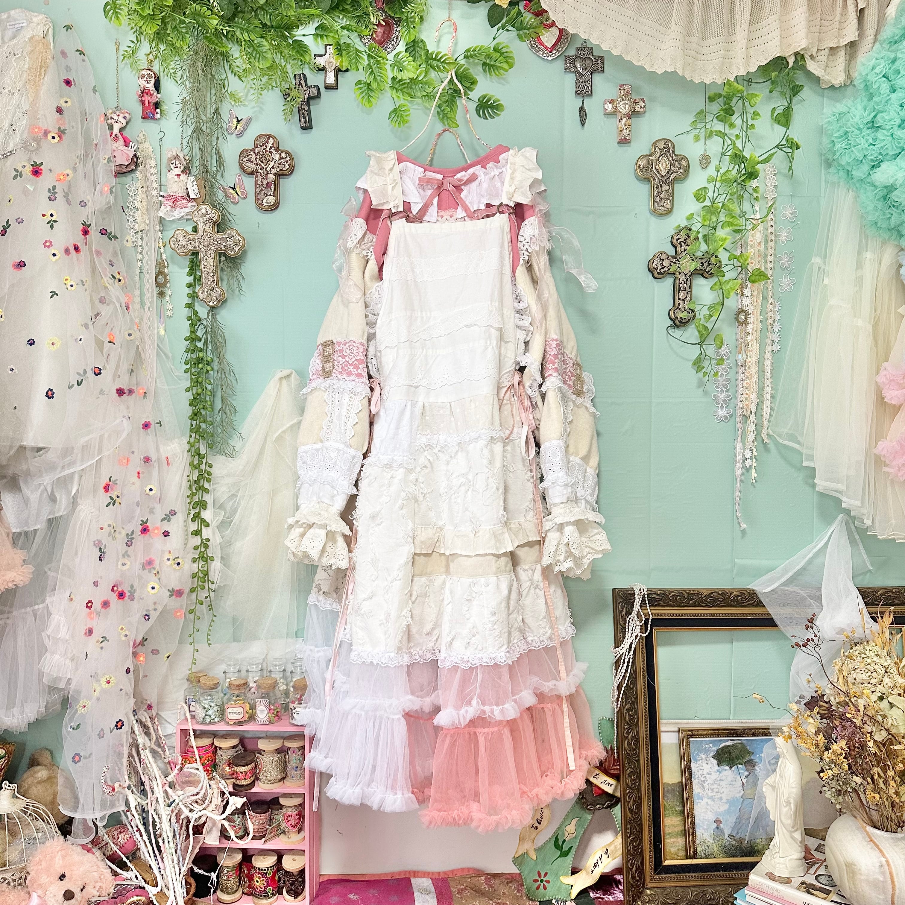 美と長寿を複合するこのピンクが長く美しさを保てるように刺繍入りの生地やクロスをふんだんに使ってワンピースもデザインしました。