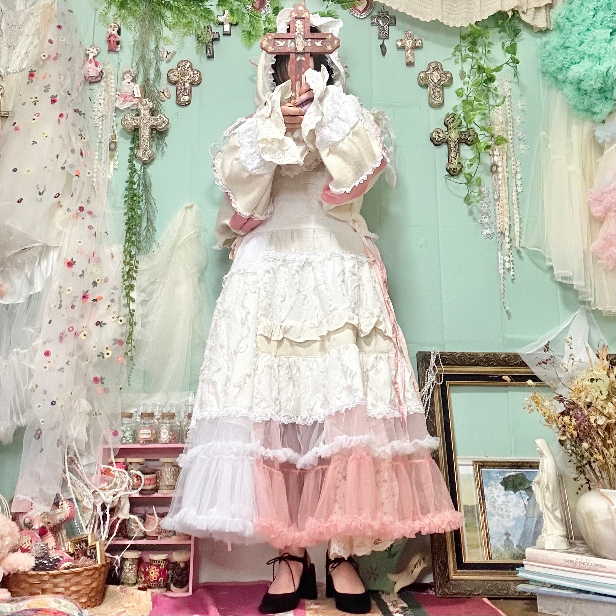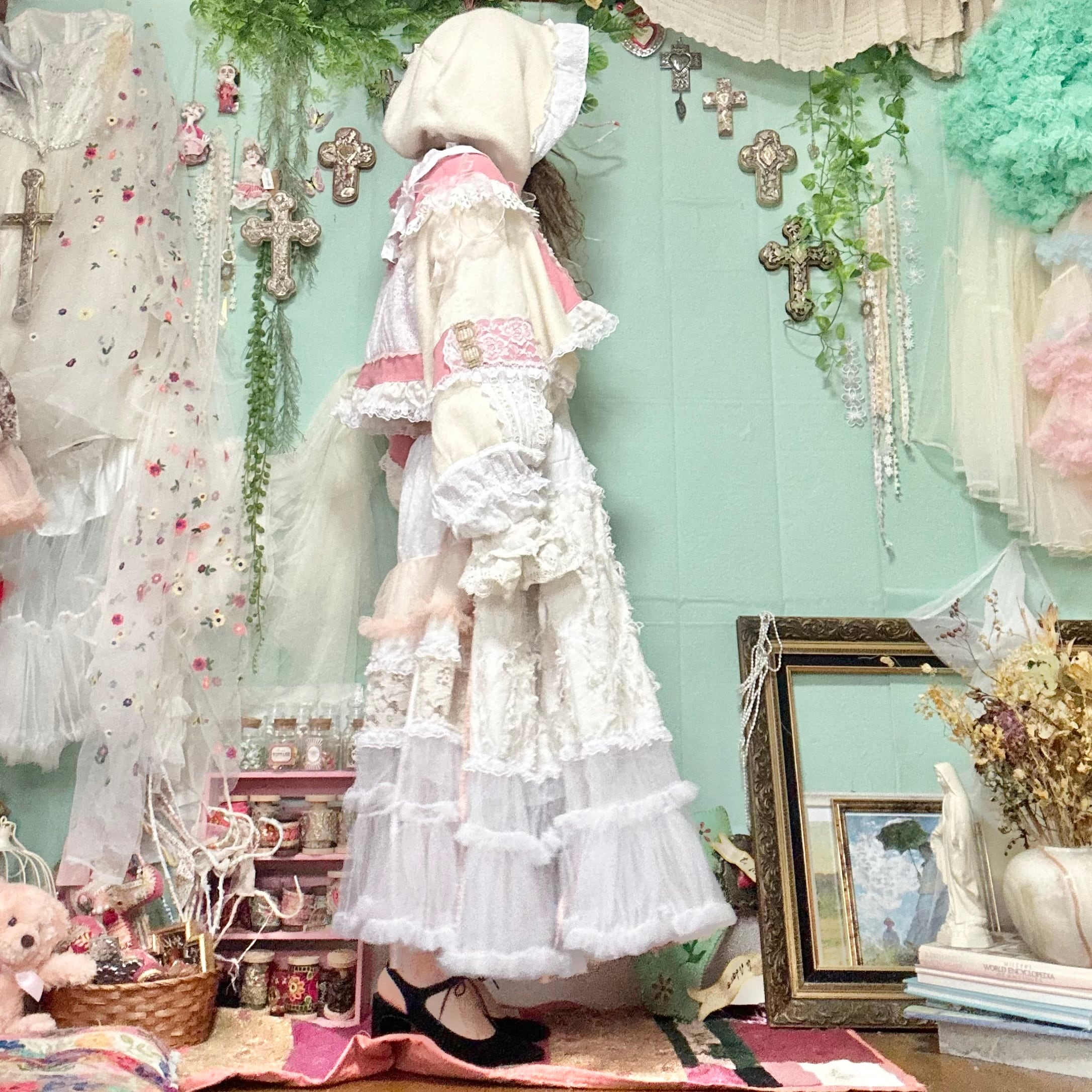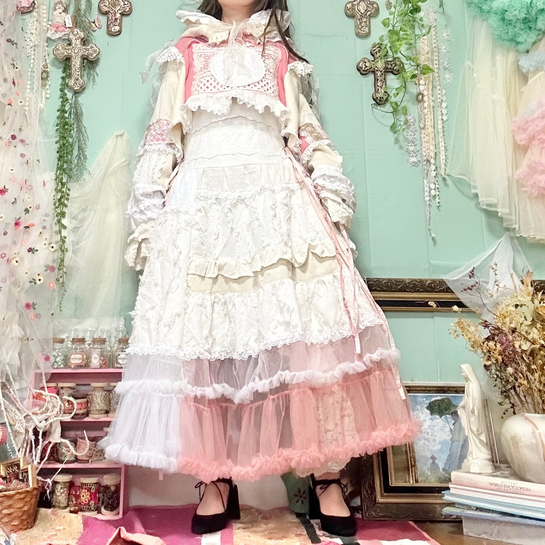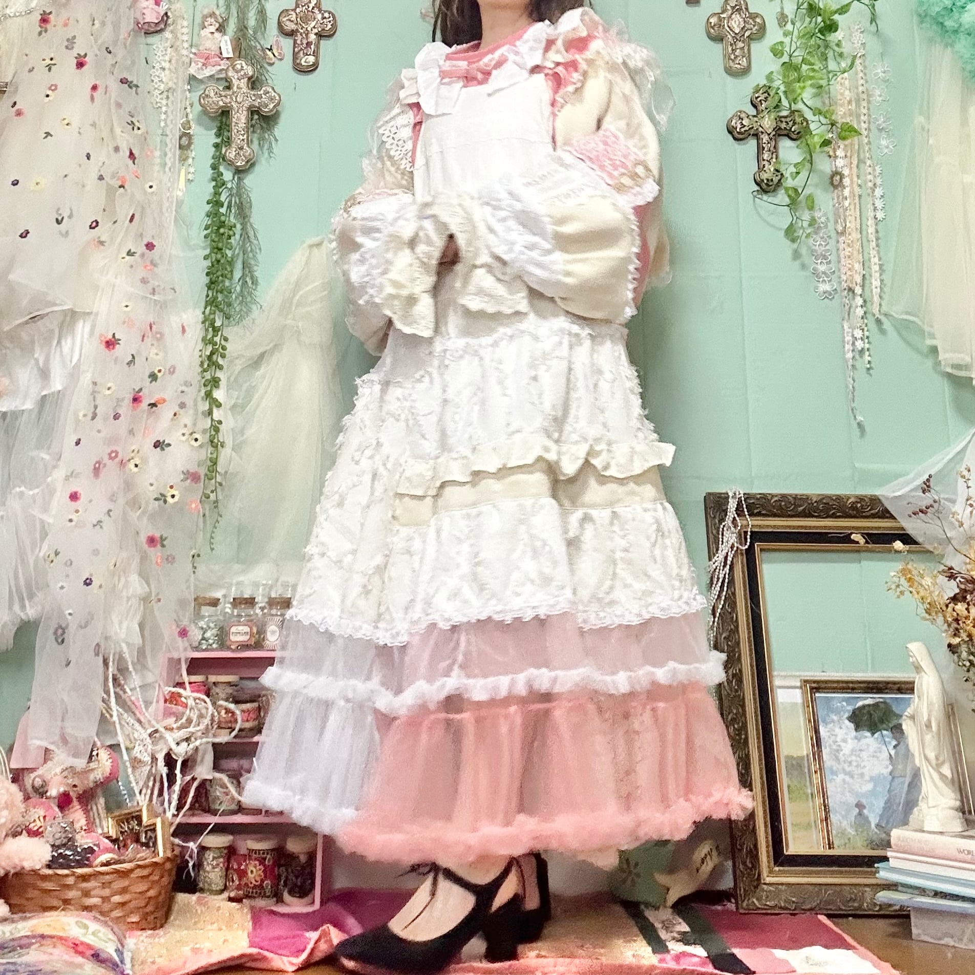 美と長寿を複合するこのピンクが長く美しさを保てるように刺繍入りの生地やクロスをふんだんに使ってワンピースもデザインしました。