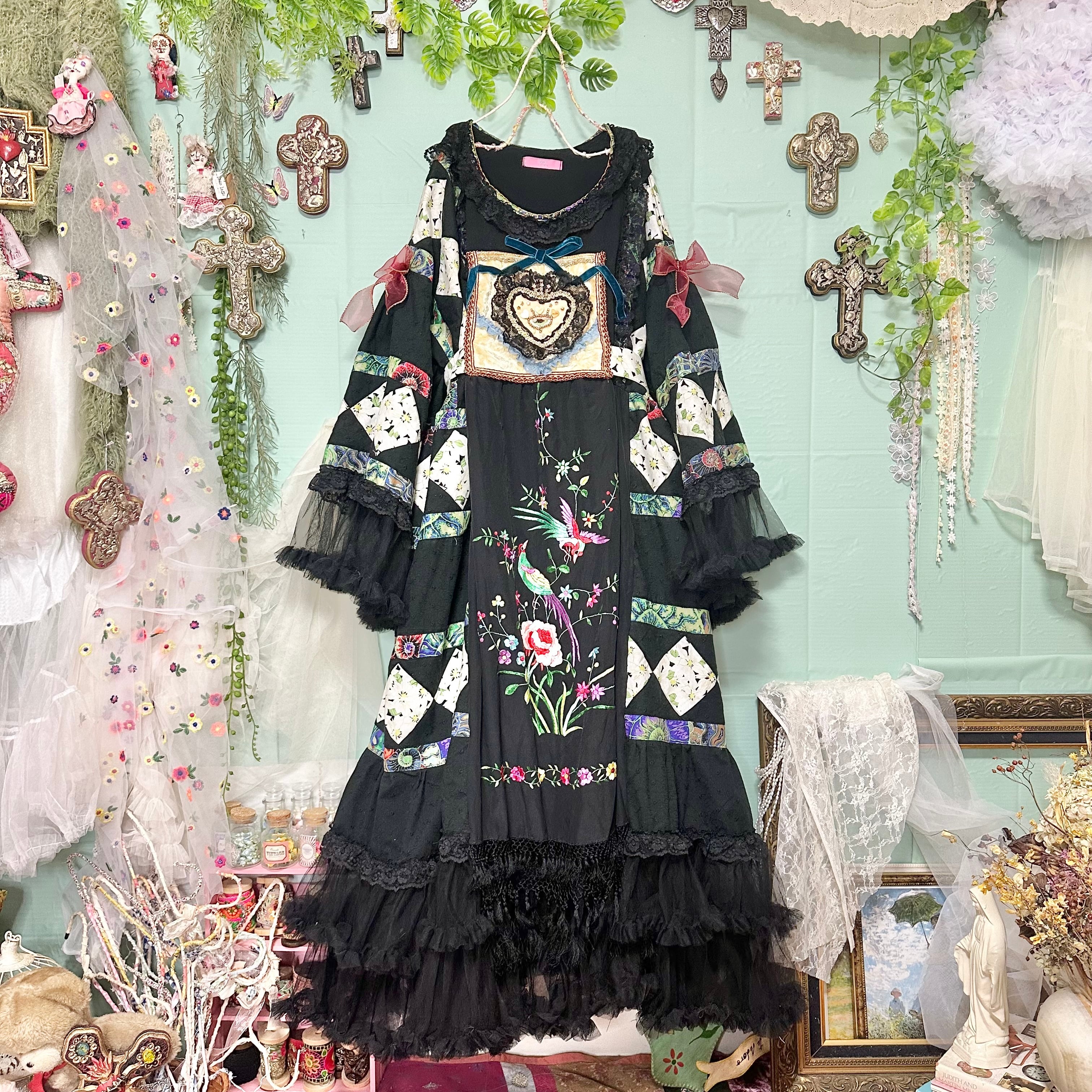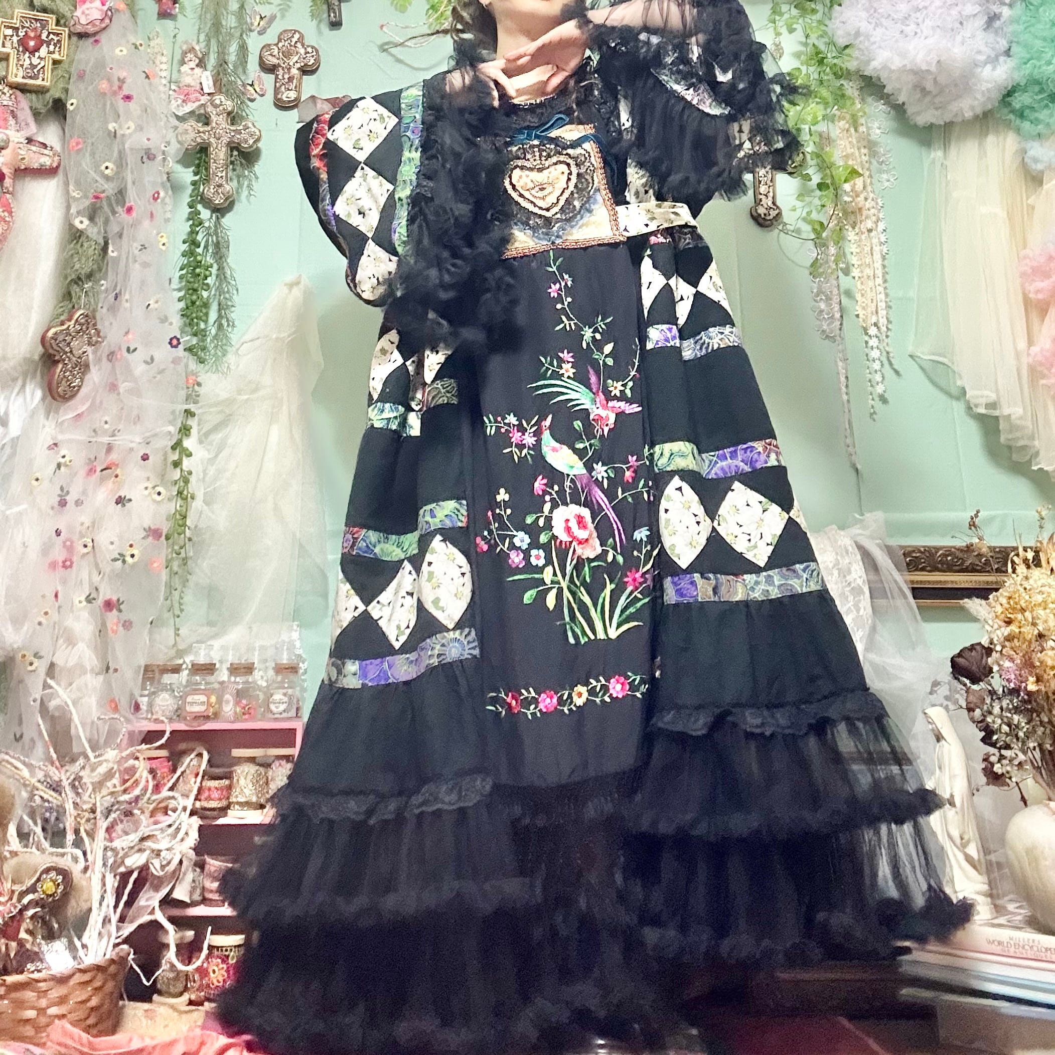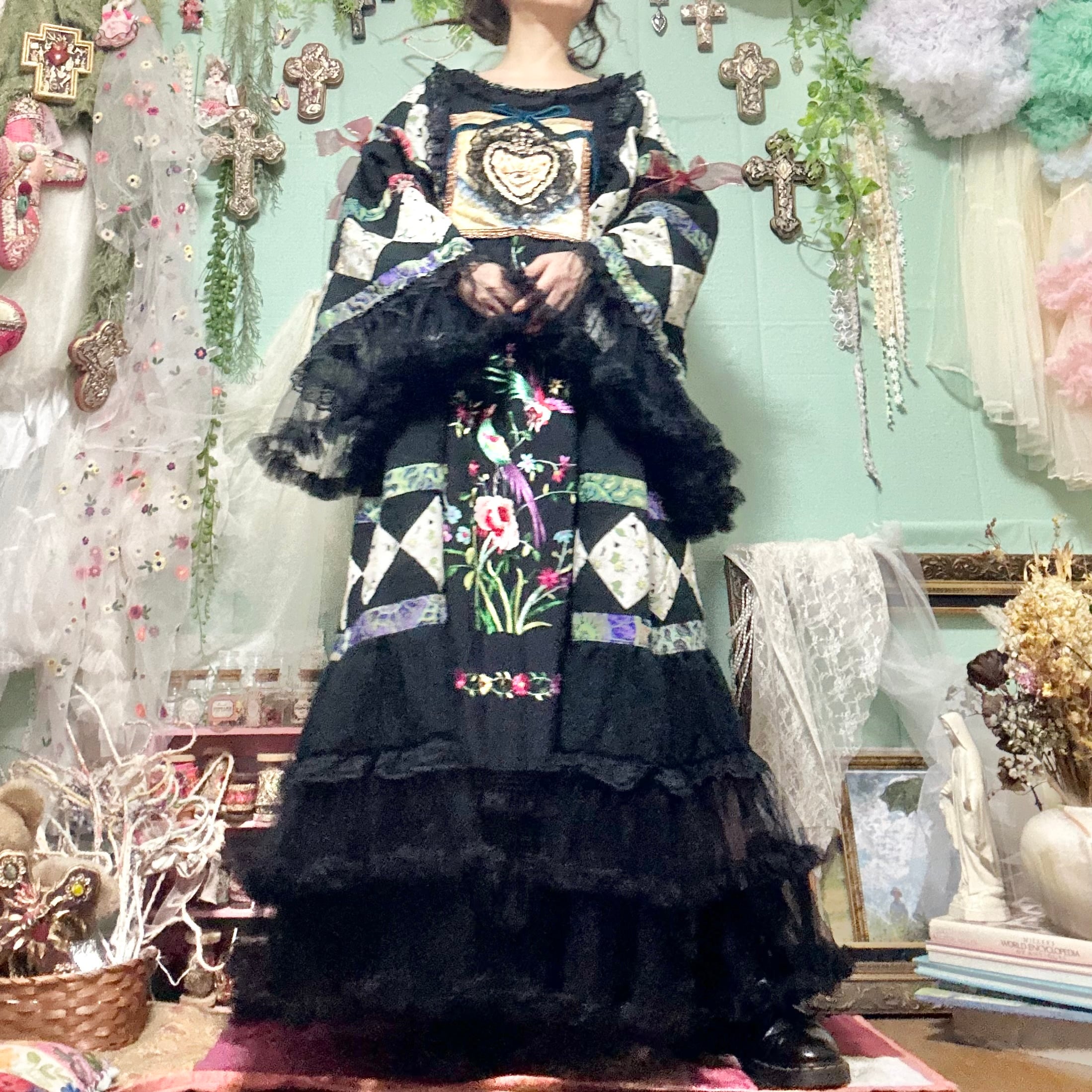 鮮やかに繁栄する花と鳥の刺繍のスカート等、無意識にあった素材を駆使し