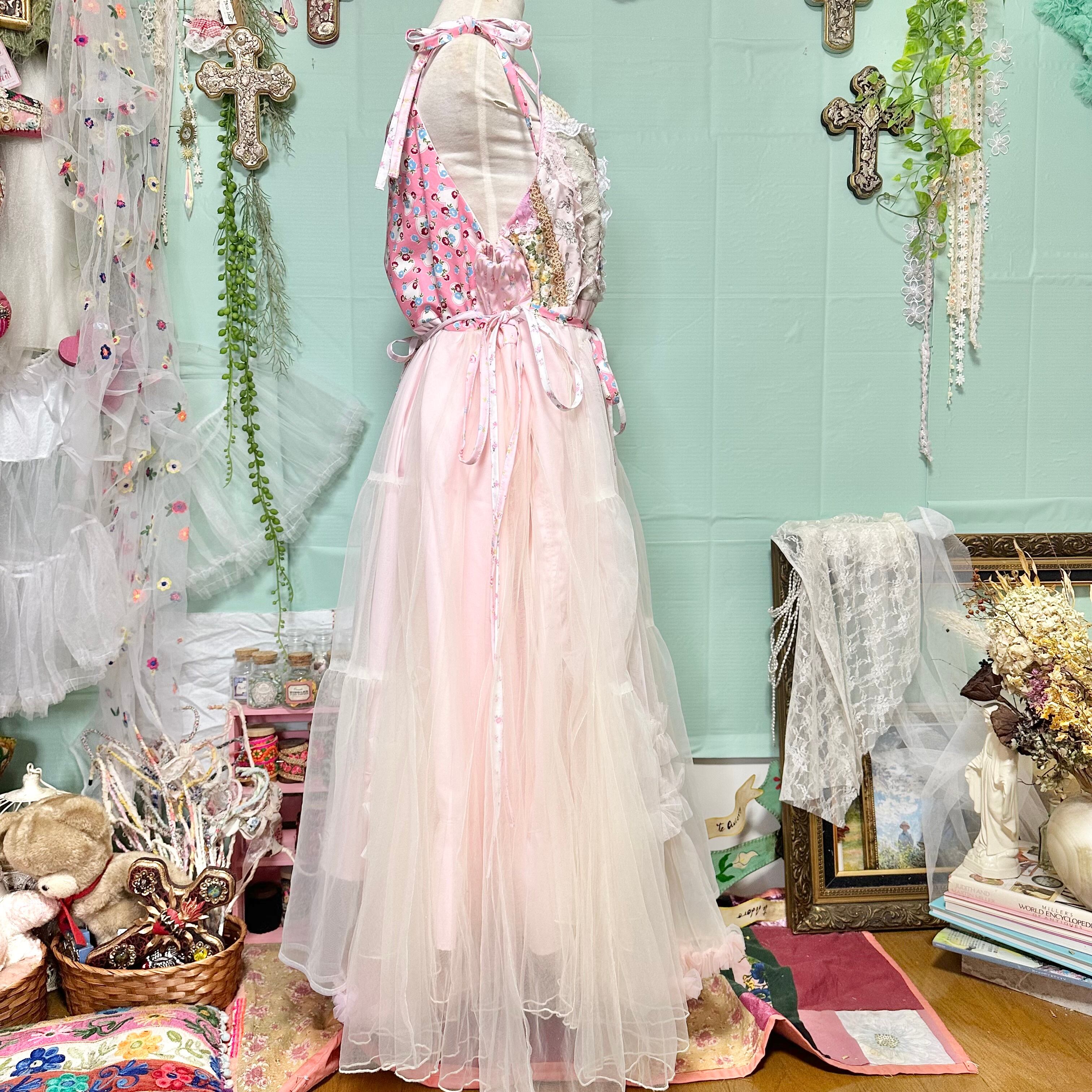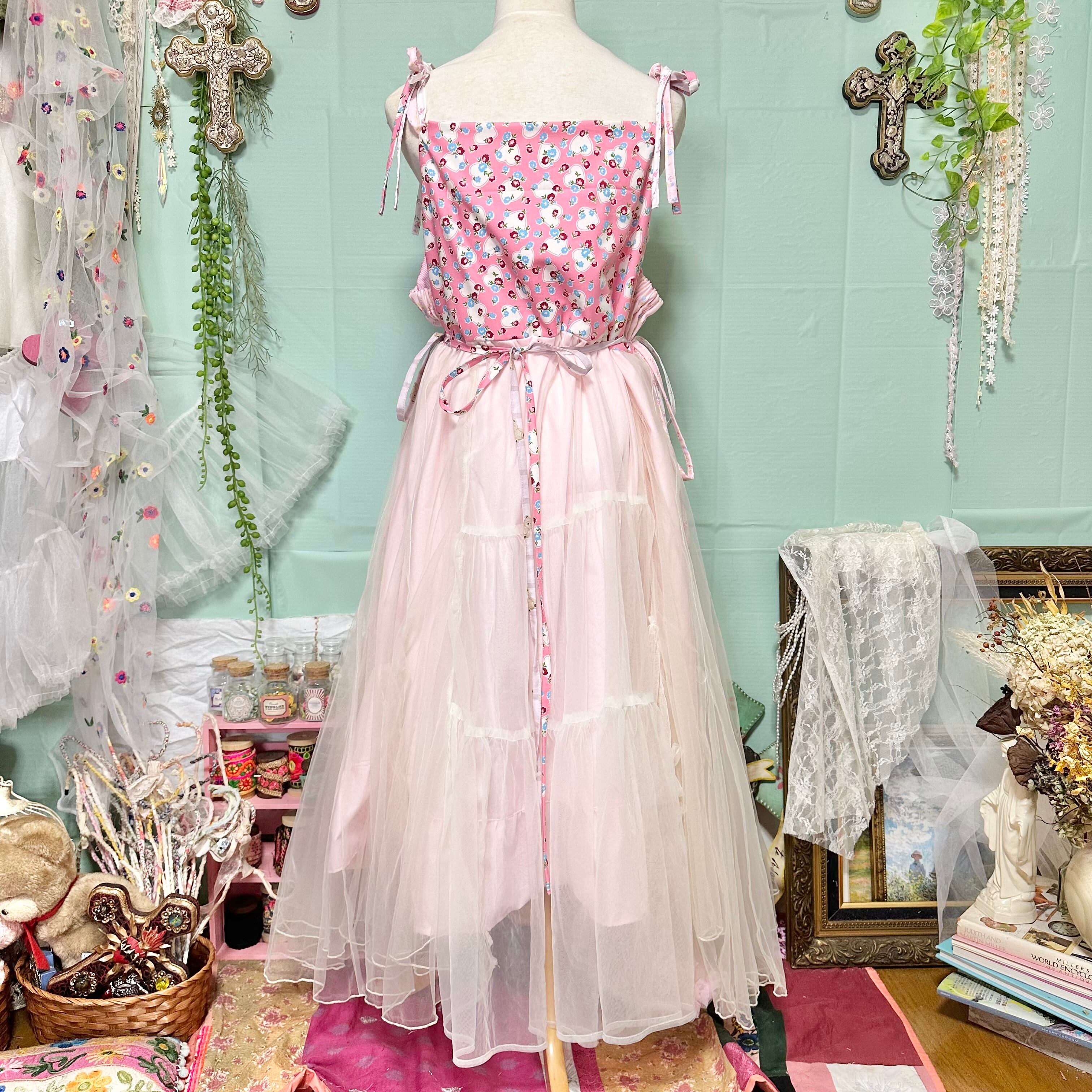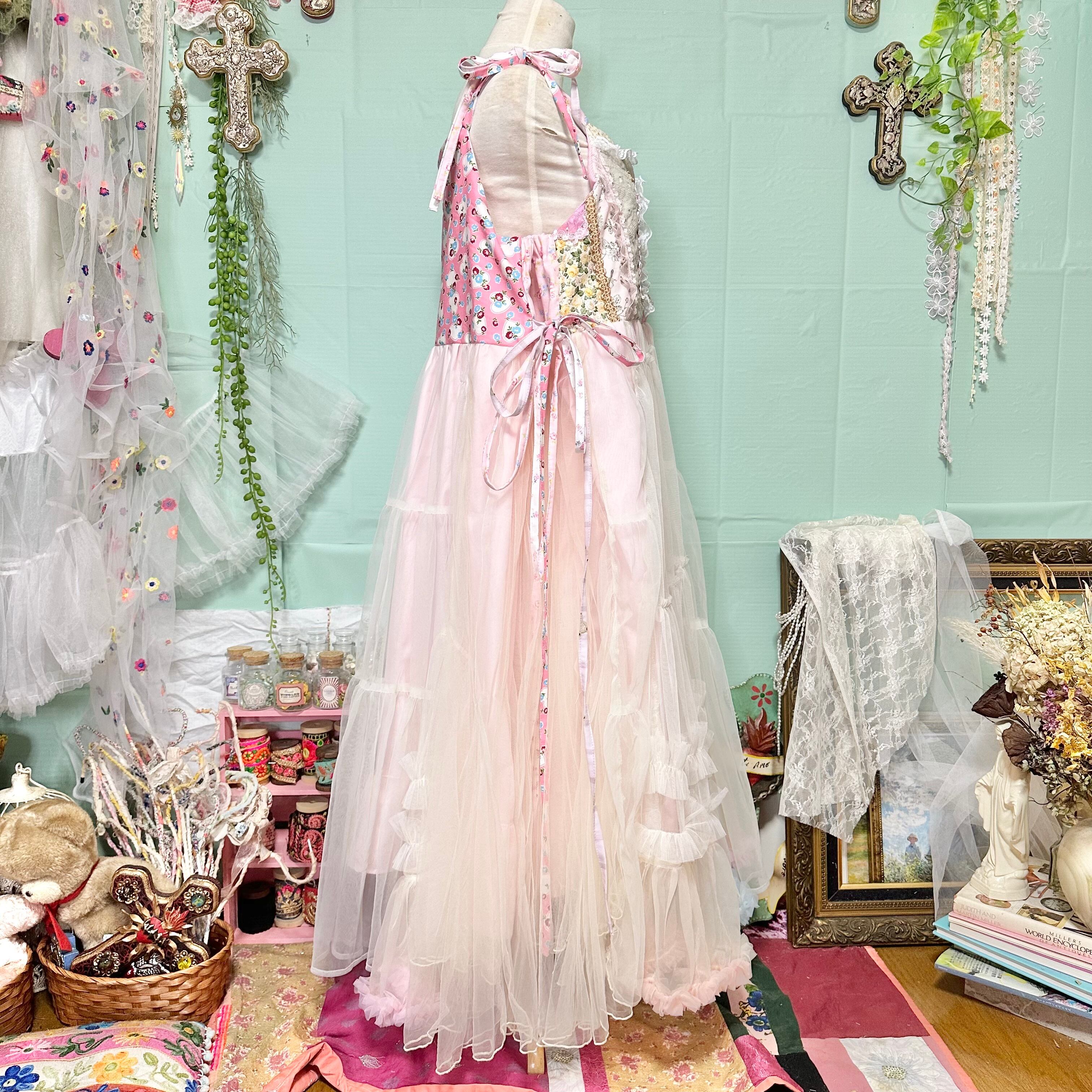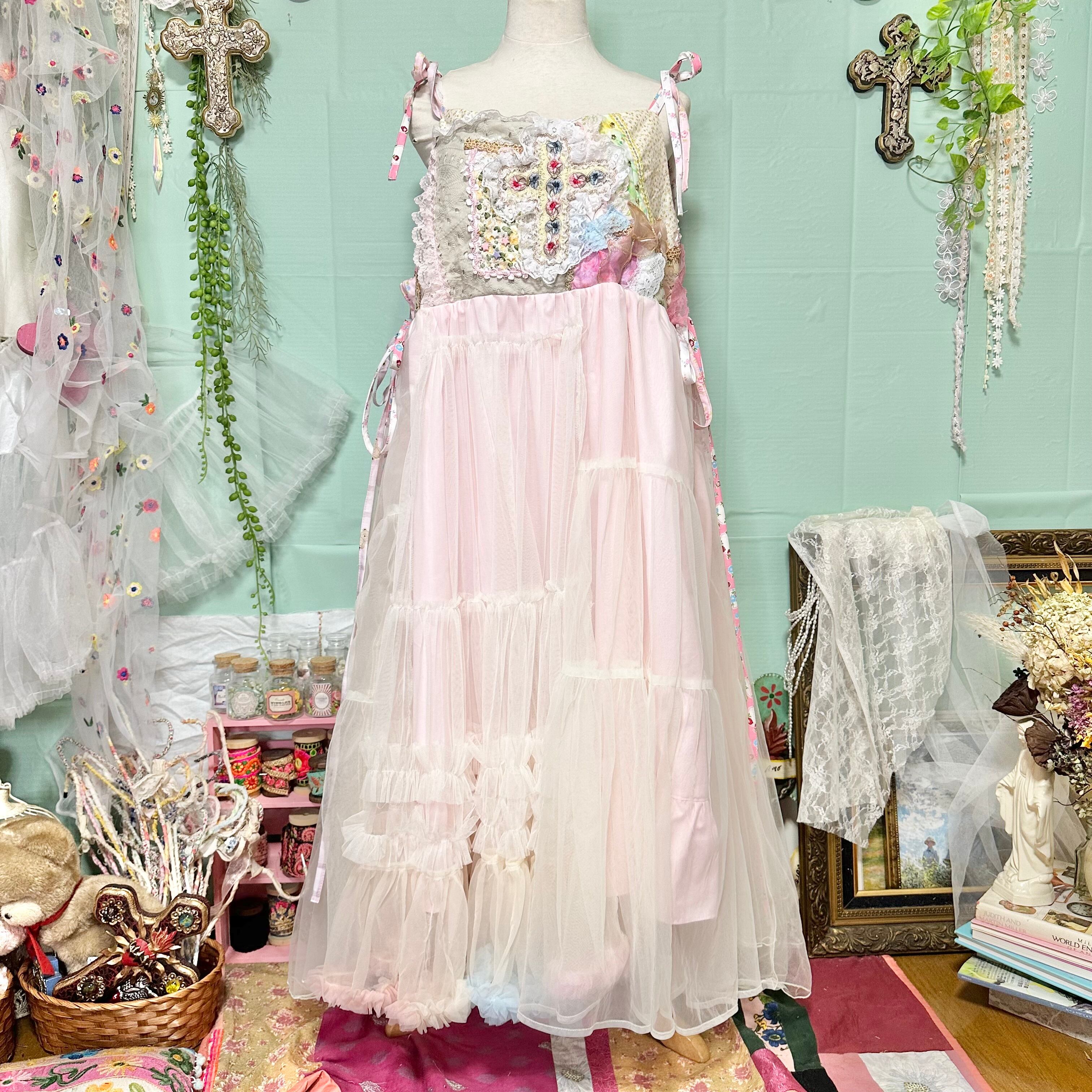 端切れとコレクションの刺繍リボンやビーズパーツ等をデコレーションしたキャミソールワンピース。