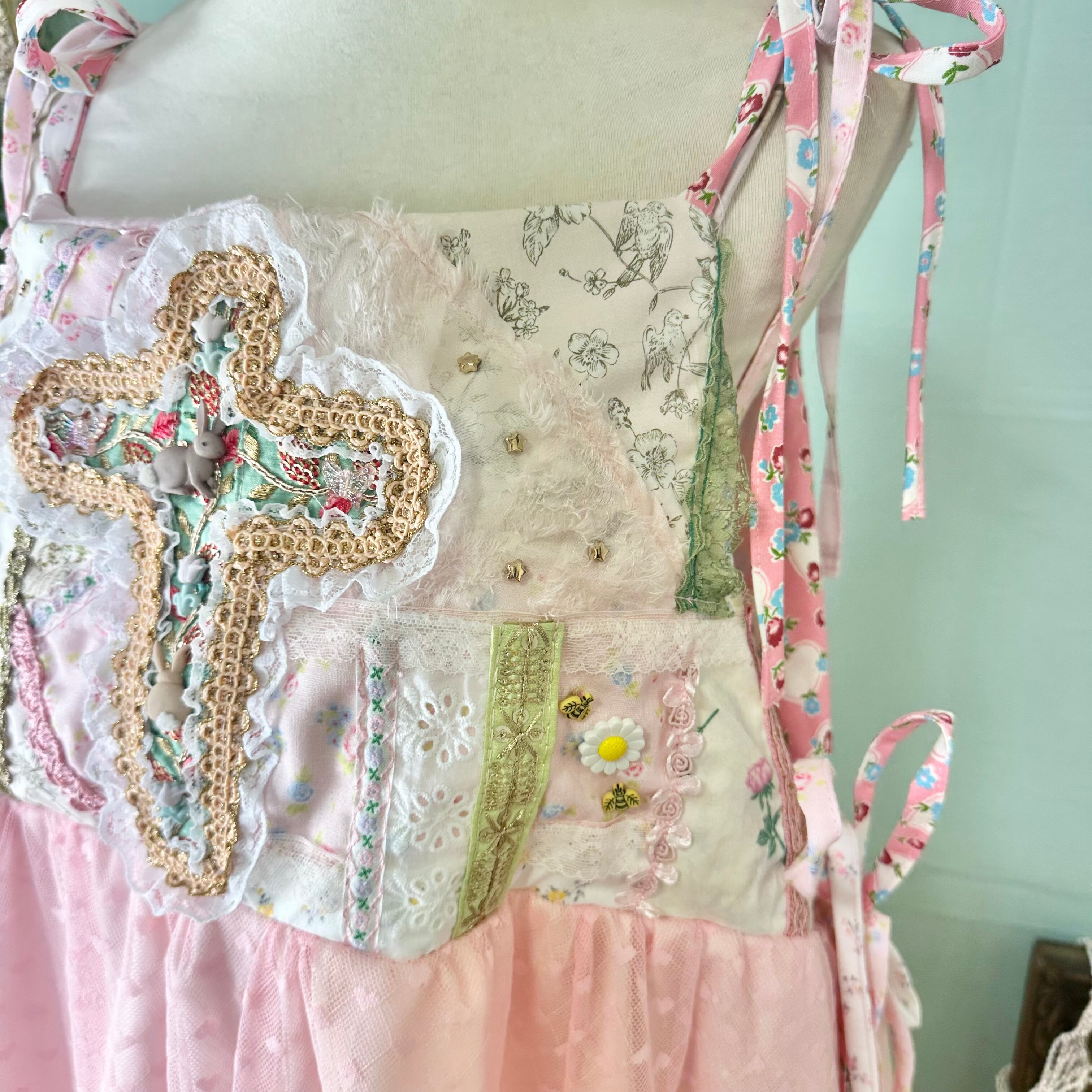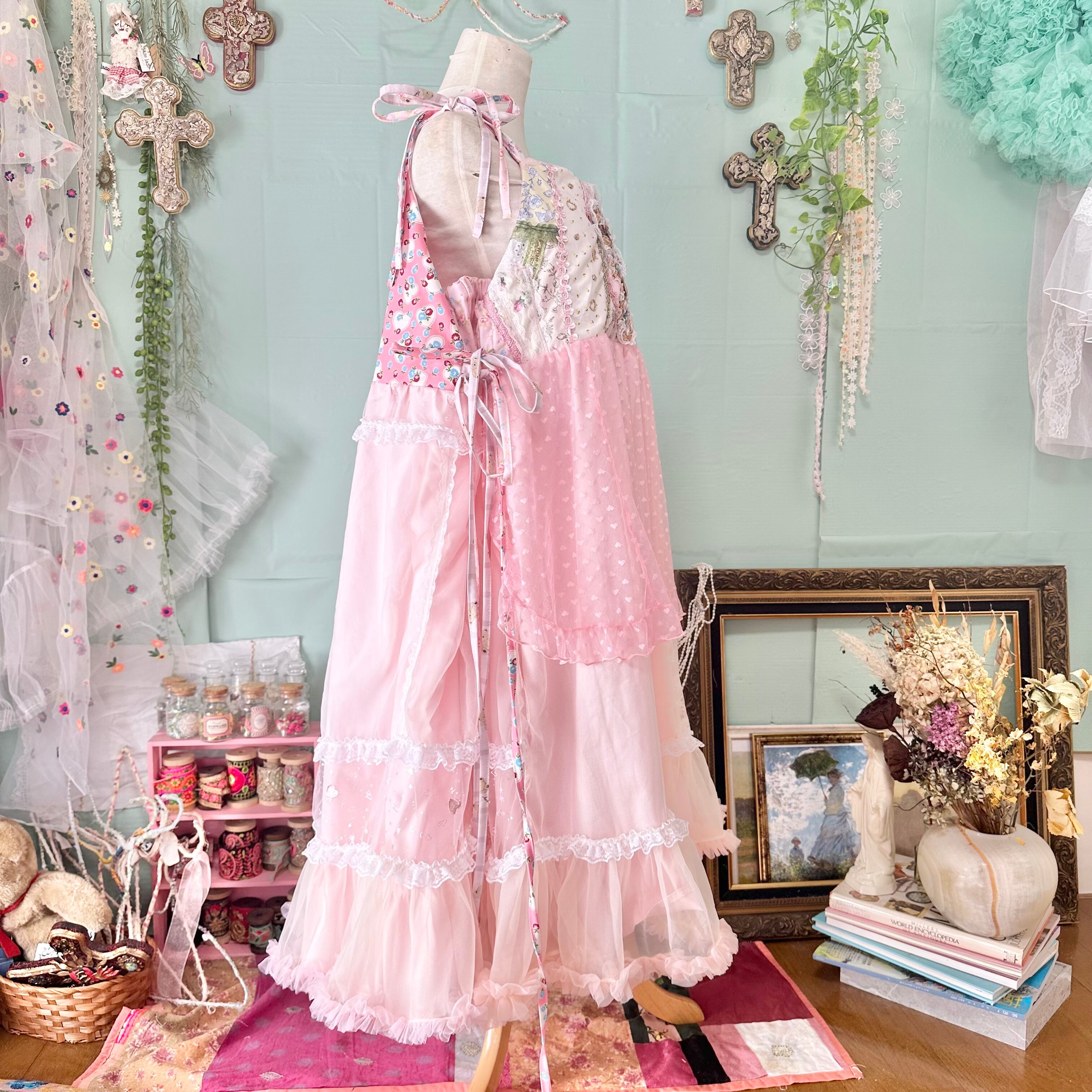 端切れとコレクションの刺繍リボンやビーズパーツ等をデコレーションしたキャミソールワンピース。