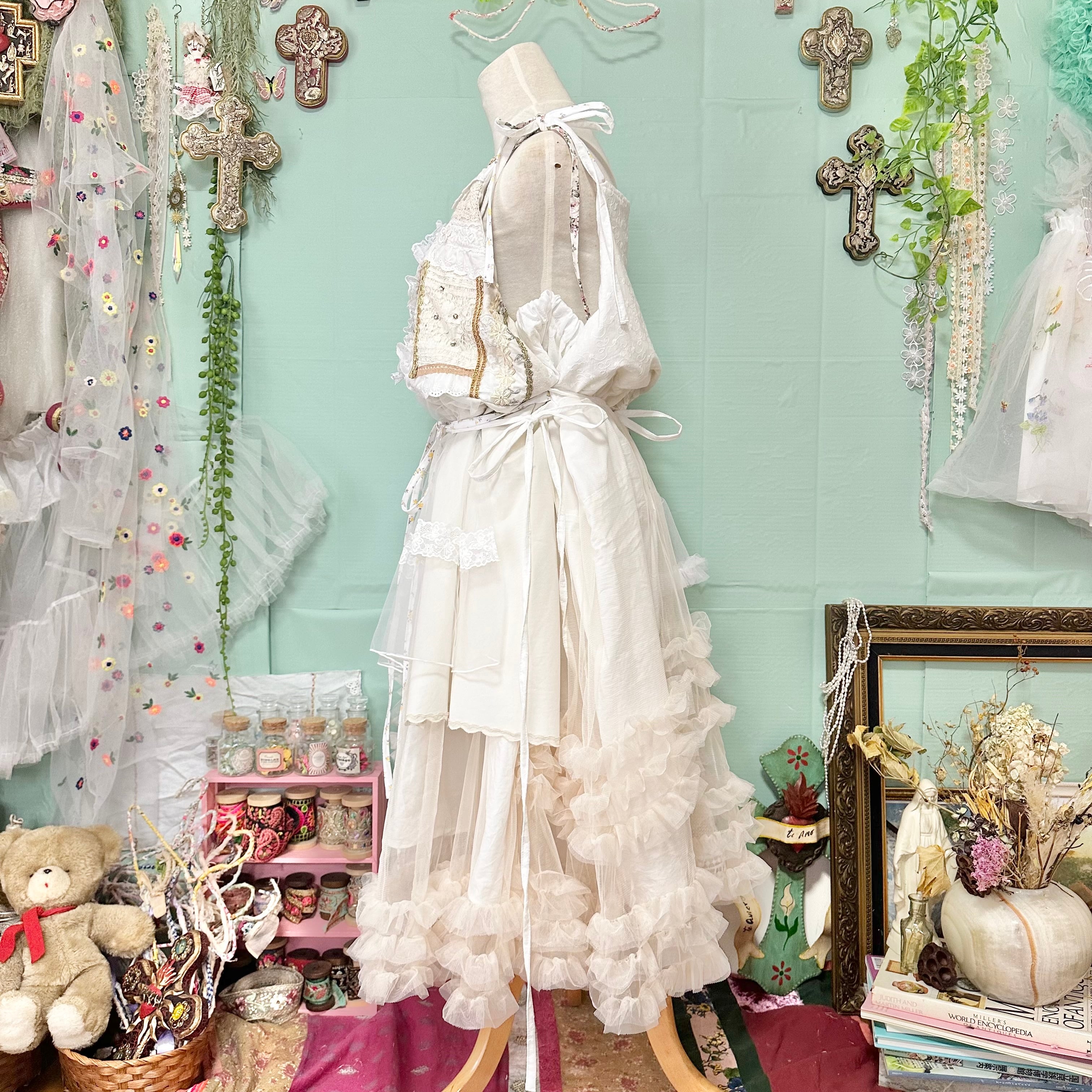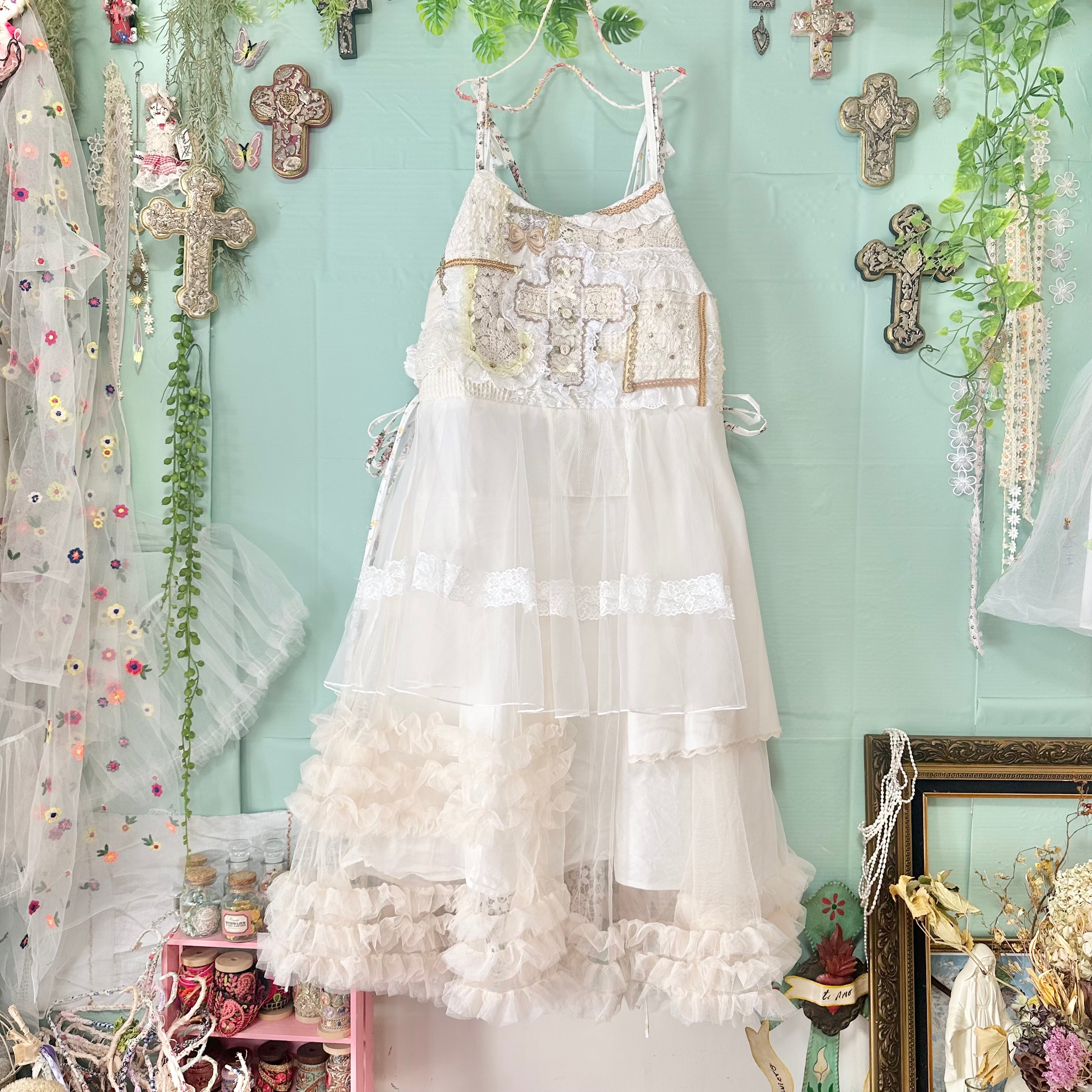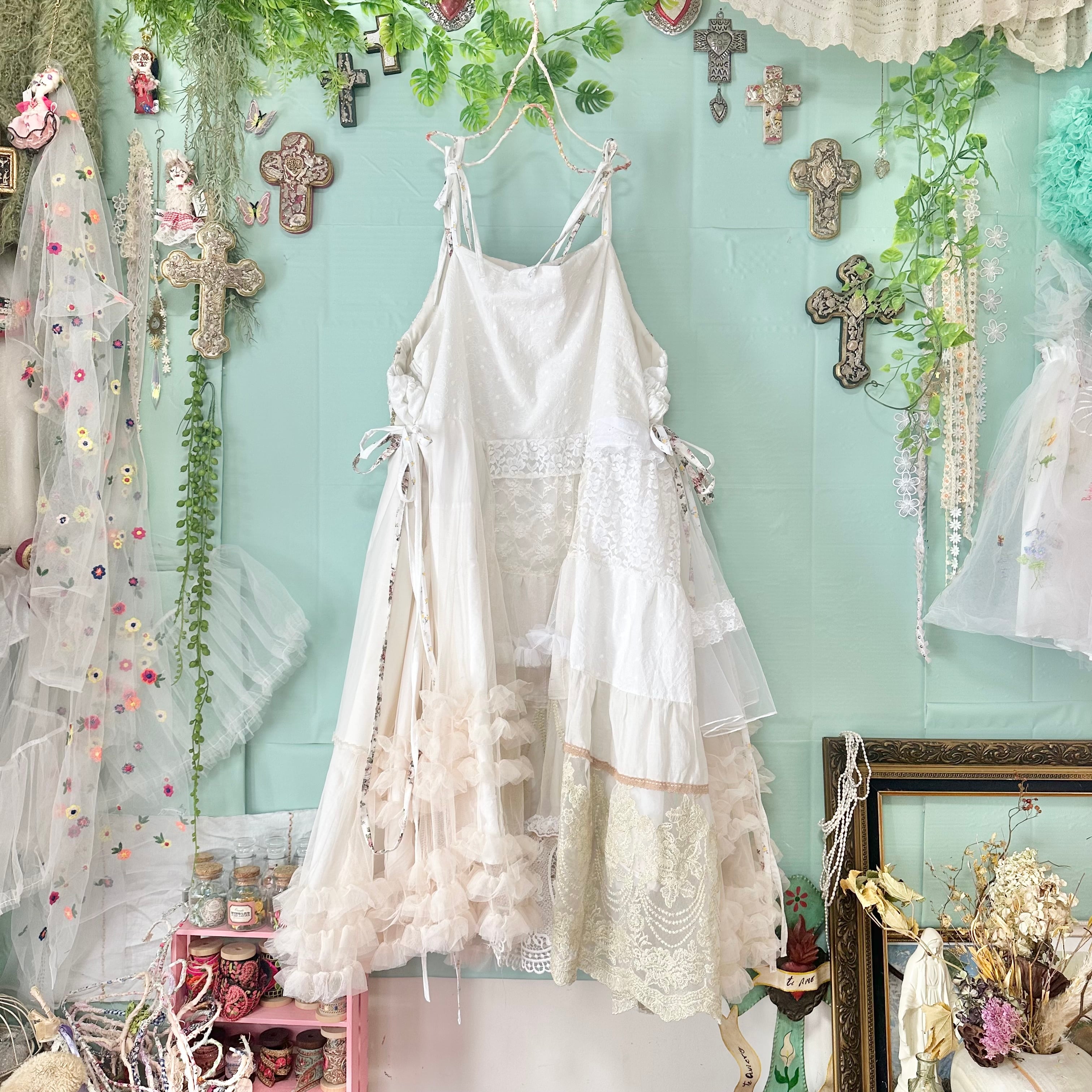 端切れとコレクションの刺繍リボンやビーズパーツ等をデコレーションしたキャミソールワンピース。