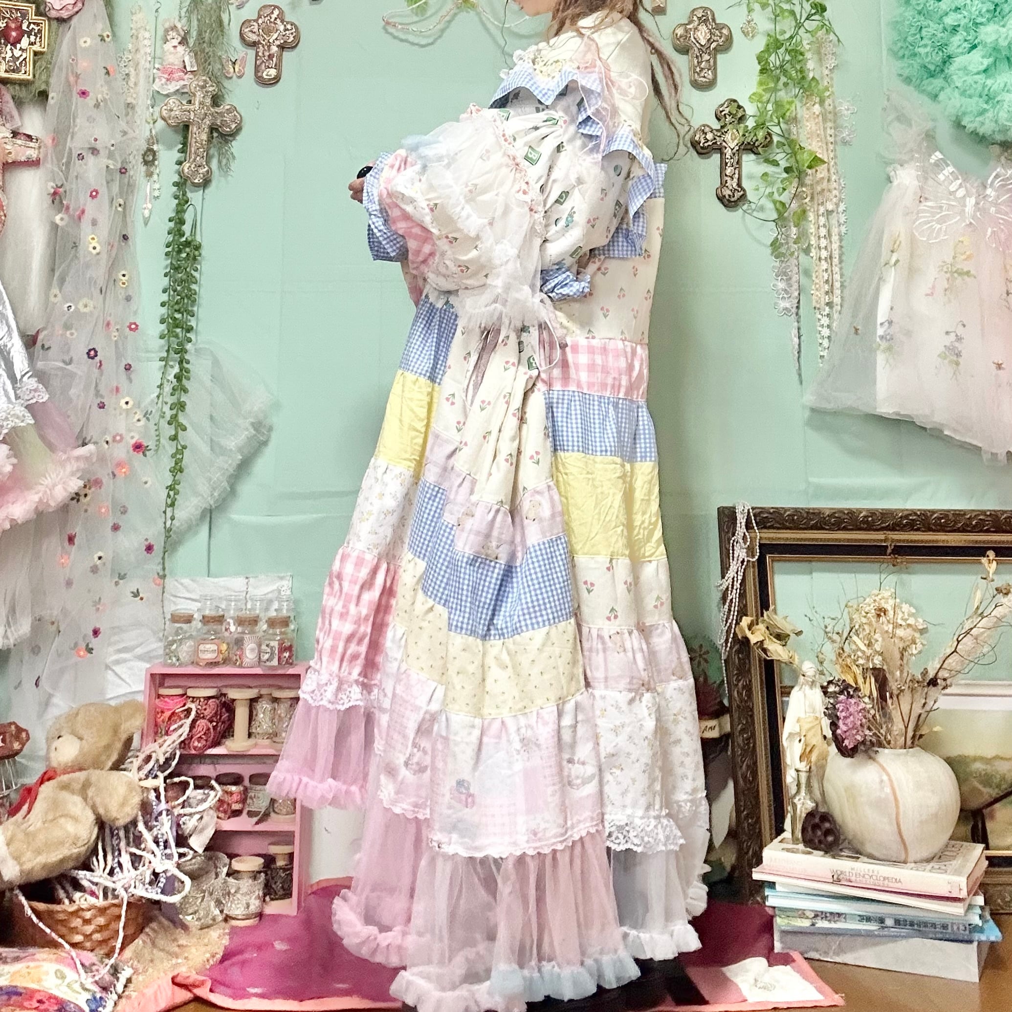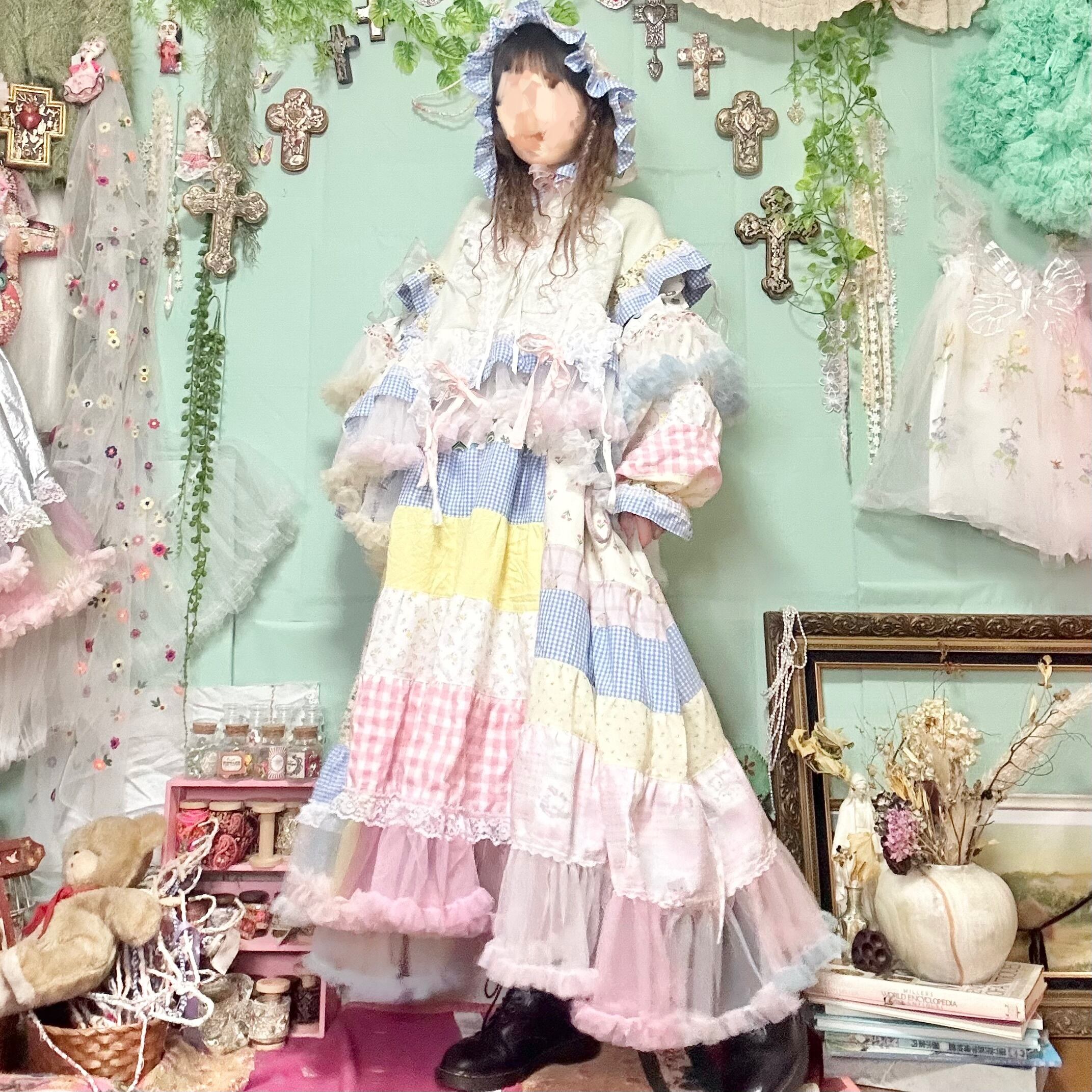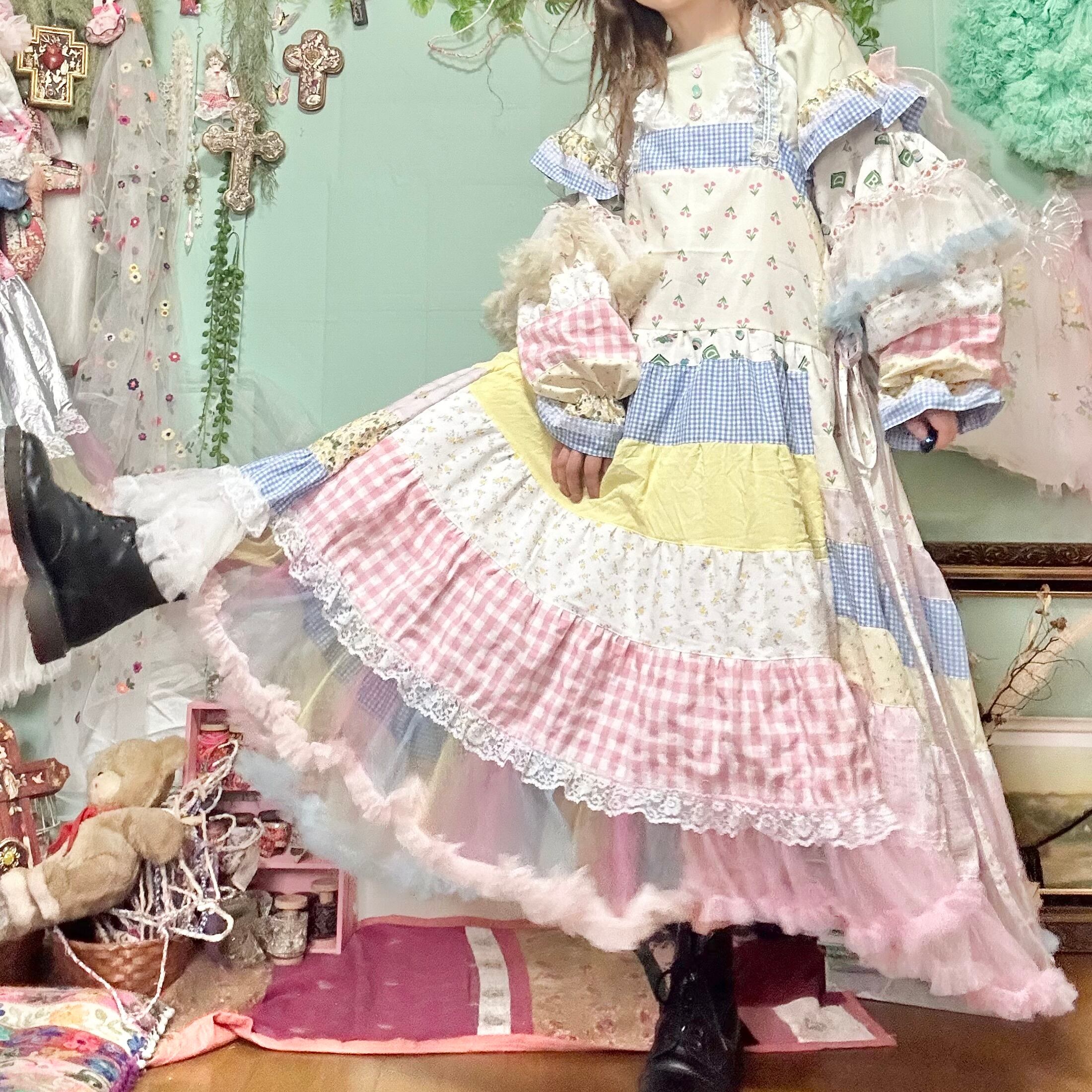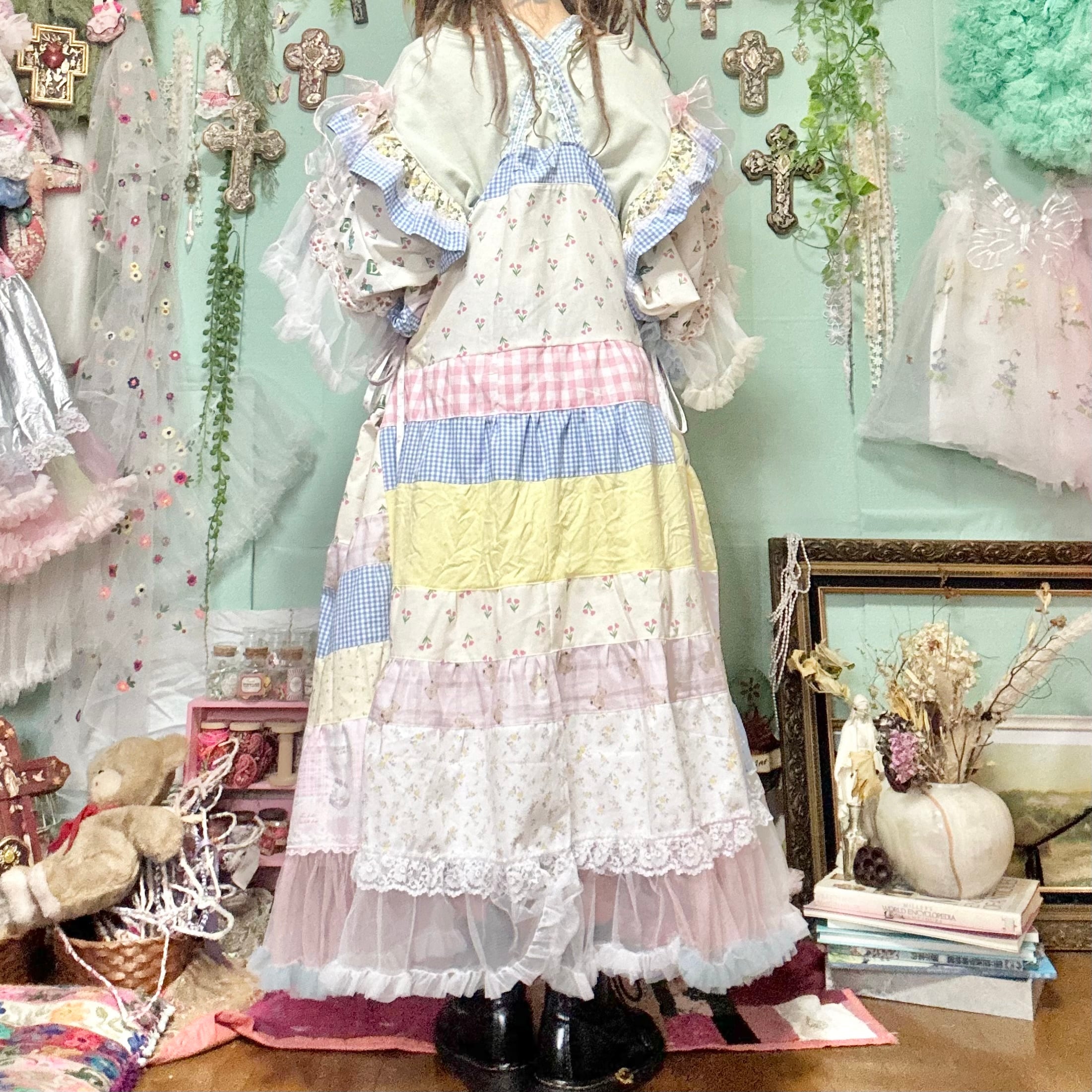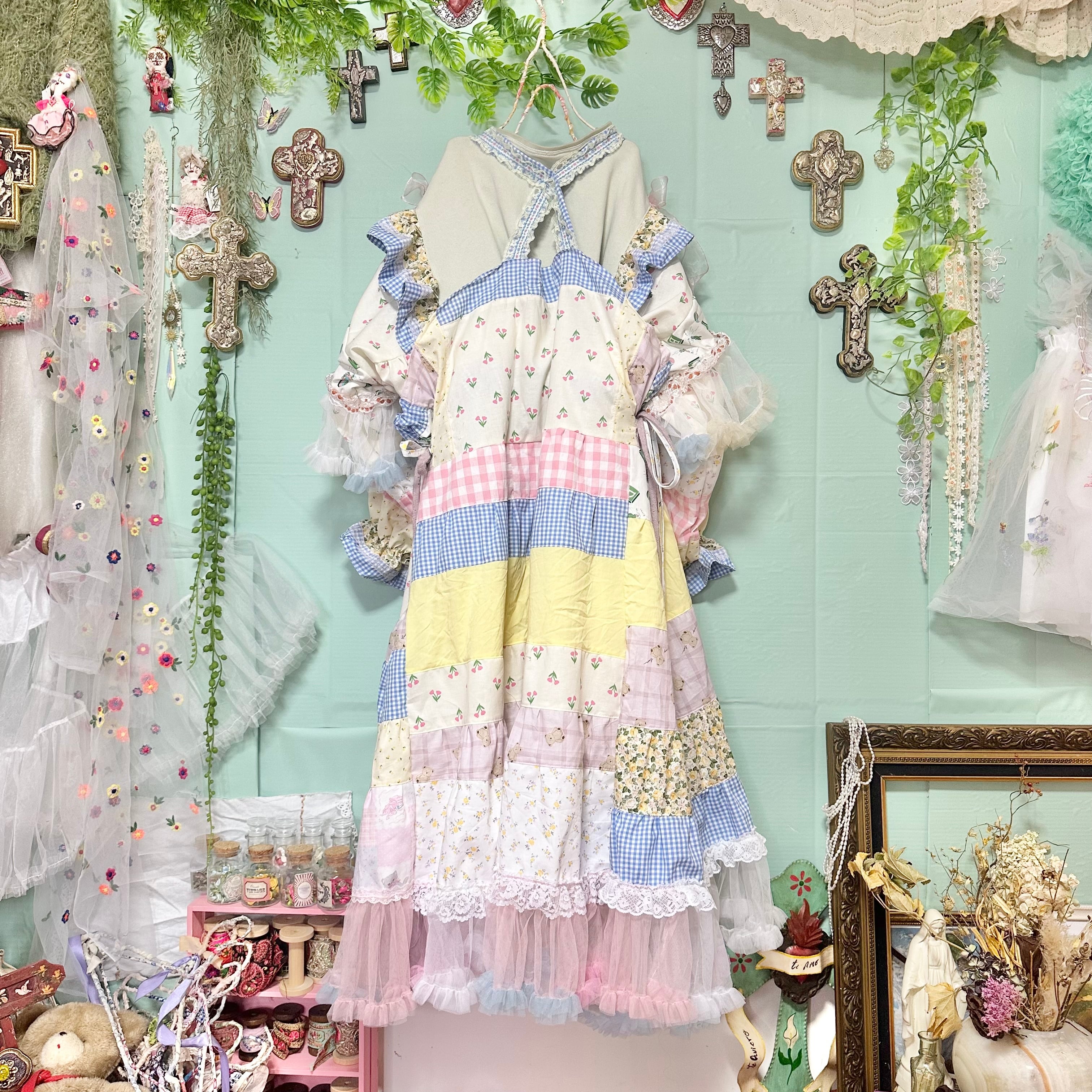 ワンピースはトップスとリンクした花柄の生地や刺繍レースやチュール等で作ったエプロンドレス。