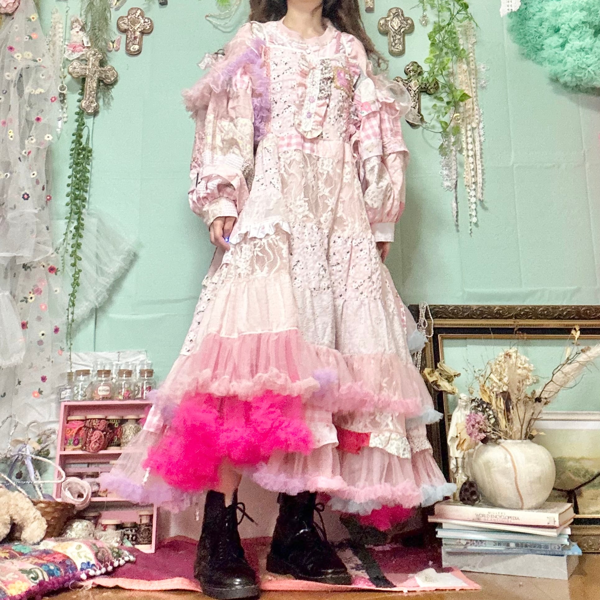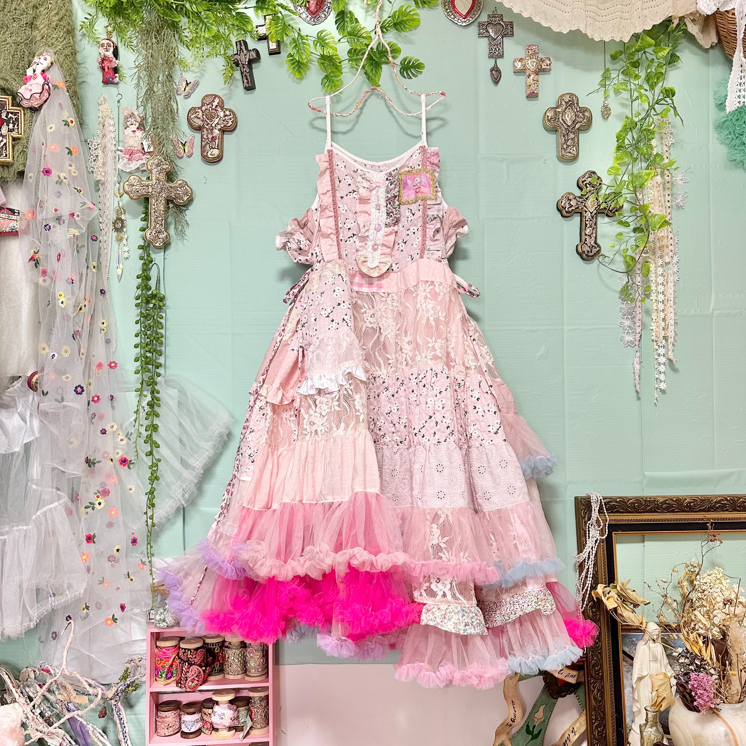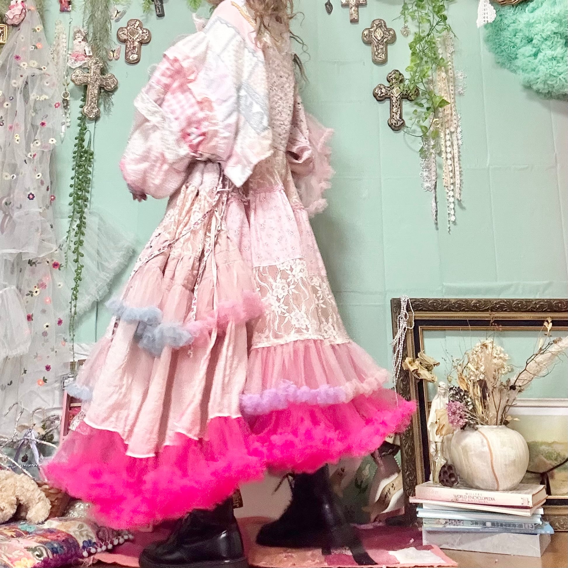 キャミソールワンピースも人気のチュールスカートをふんだんにパッチワークしレイヤードスカートにリメイクしたワンピースです。