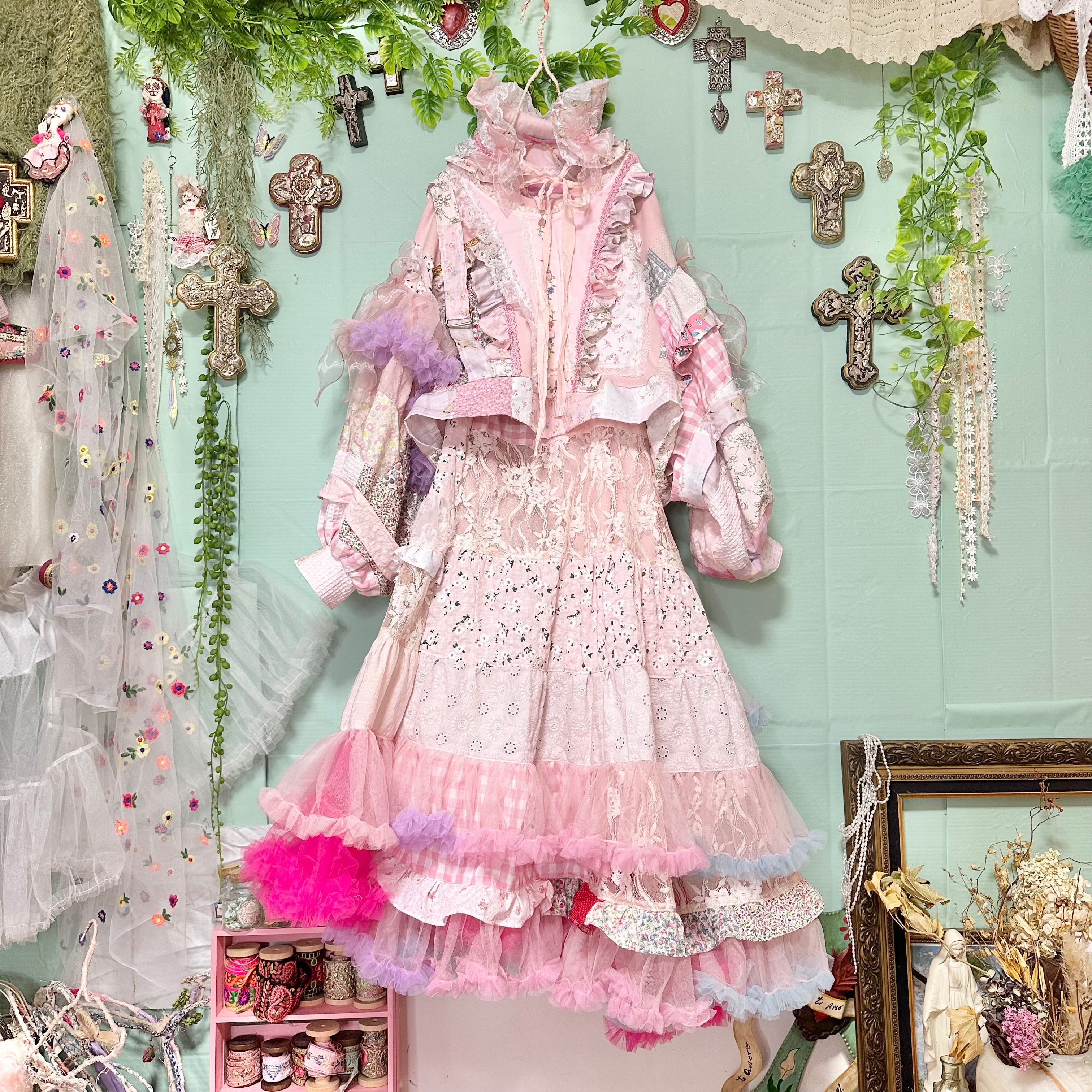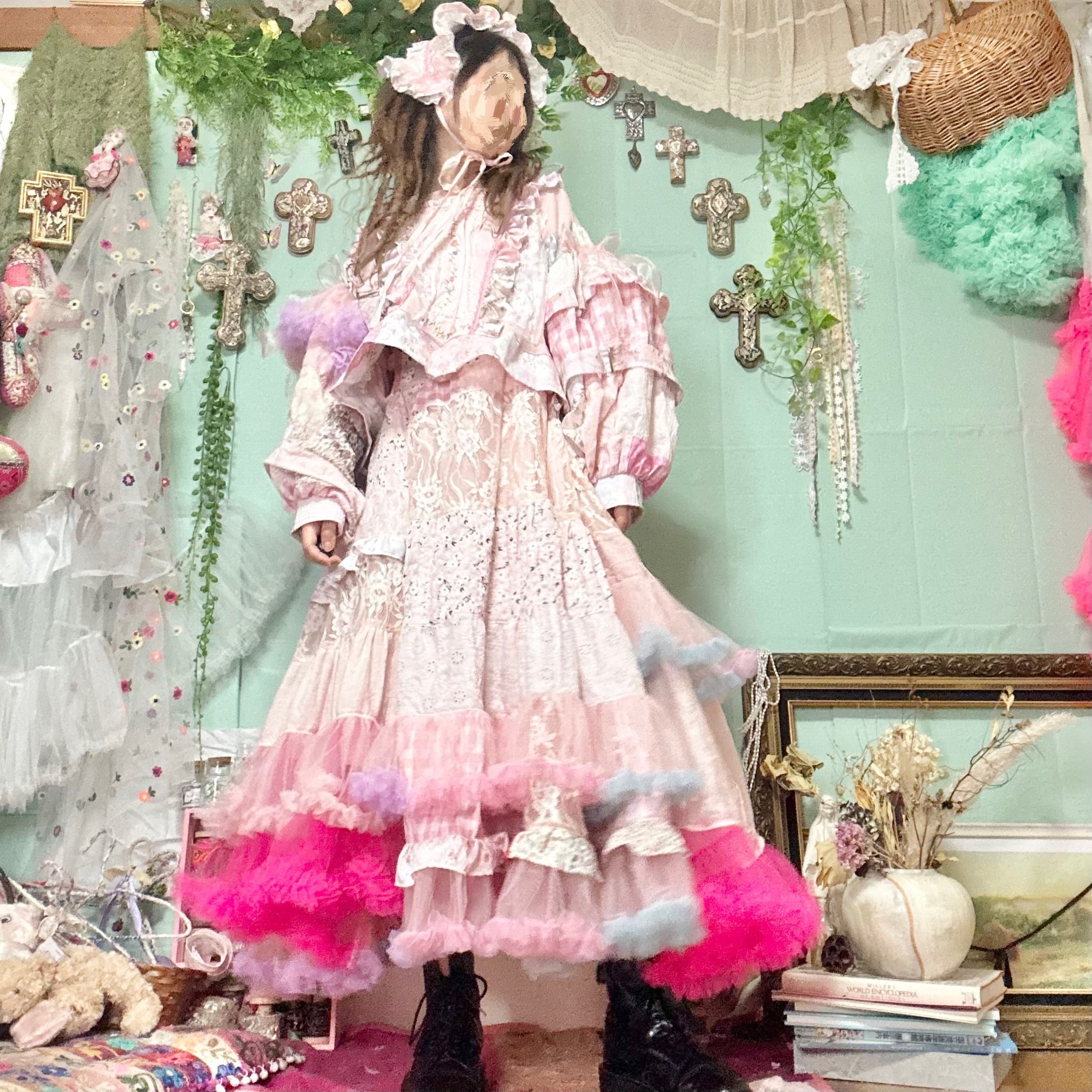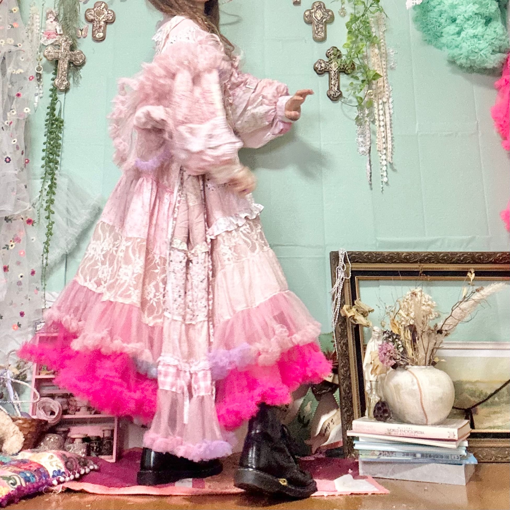 キャミソールワンピースも人気のチュールスカートをふんだんにパッチワークしレイヤードスカートにリメイクしたワンピースです。