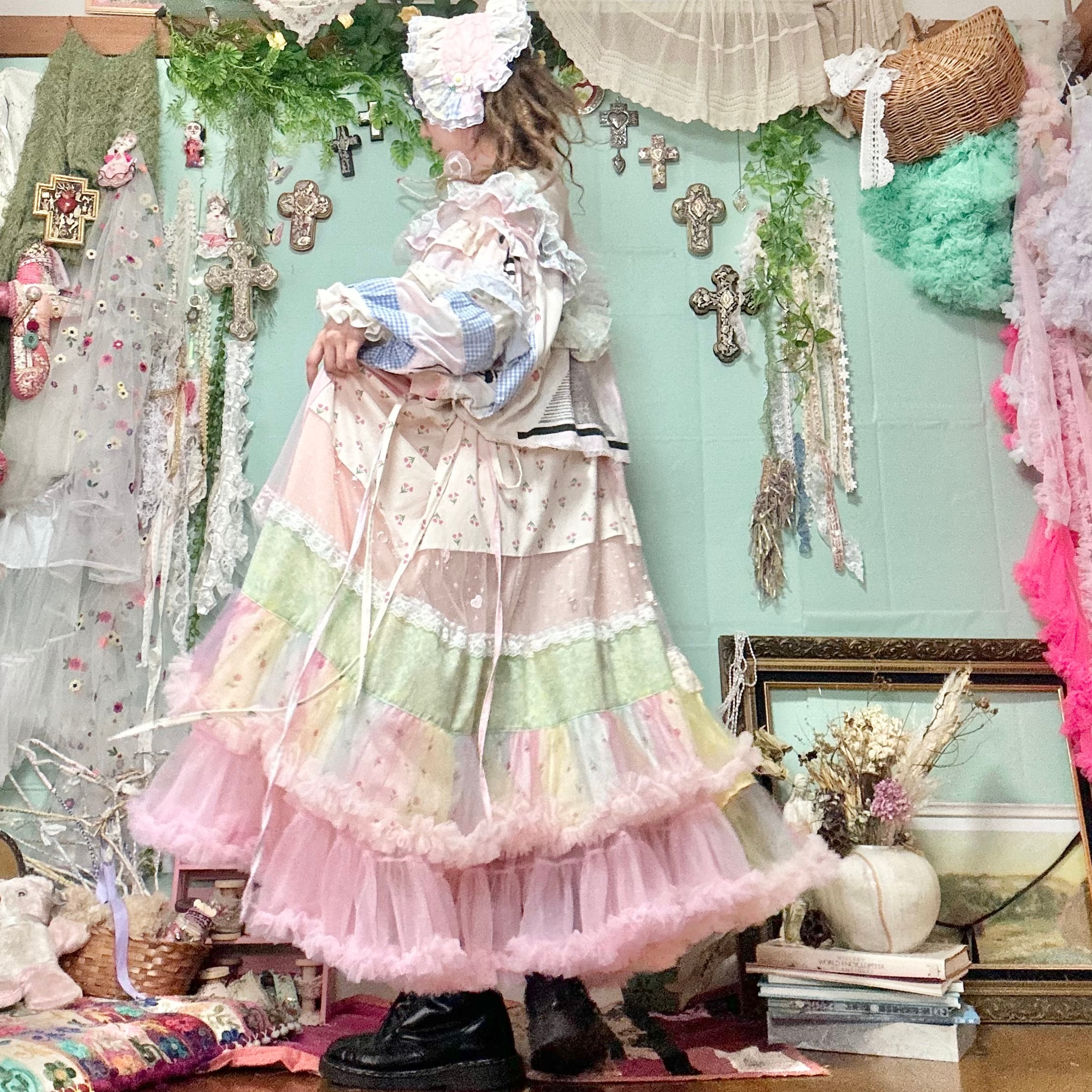 マーブル調の古着のワンピースにトップスに使ったヴィンテージのランジェリーのスカート部分やチュールスカートを合わせた